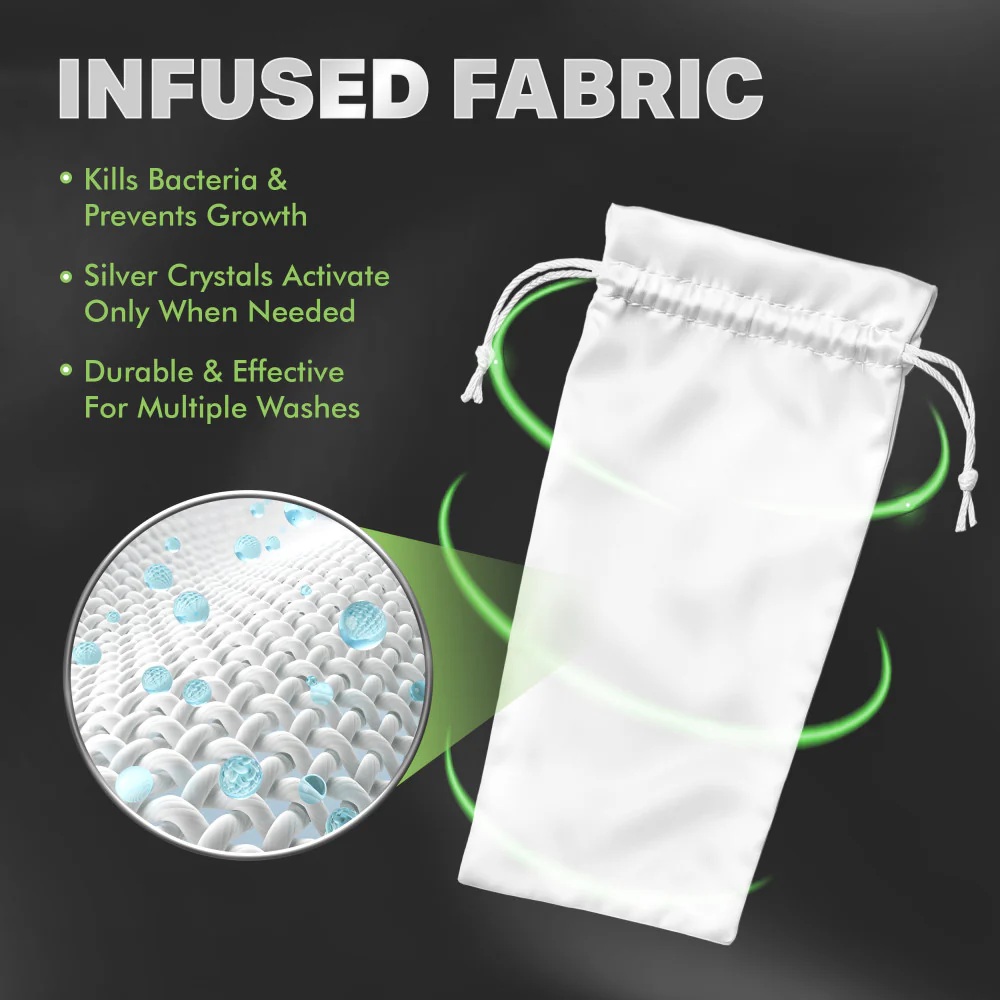 Je vyrobený ze saténově hebké látky, která nepouští vlákna. Povrch obsahuje ultrajemné krystaly stříbra, které uvolňují ionty kontrolovanou rychlostí pouze tehdy, když vzniknou podmínky pro růst bakterií.