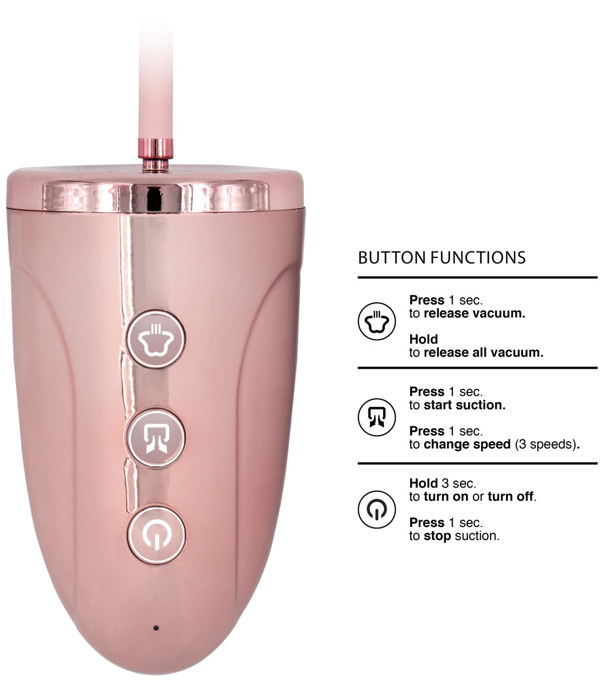 Jak se ovládá? Podržením spodního tlačítka po dobu 3 sekund pumpu zapnete/vypnete, prostředním tlačítkem zapínáte sání a ovládáte jeho intenzitu a posledním tlačítkem uvolňujete podtlak buď postupně, nebo úplně (stačí jej podržet).