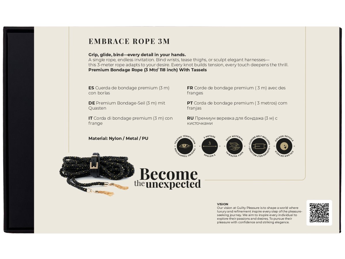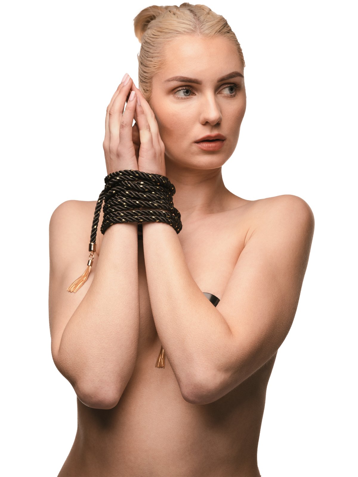 Lano má konce ozdobené zlatými střapci a dostanete k němu i řemínek s přezkou pro snadné uložení. Je měkké, pružné a příjemné na dotek – hodí se i na delší hry.