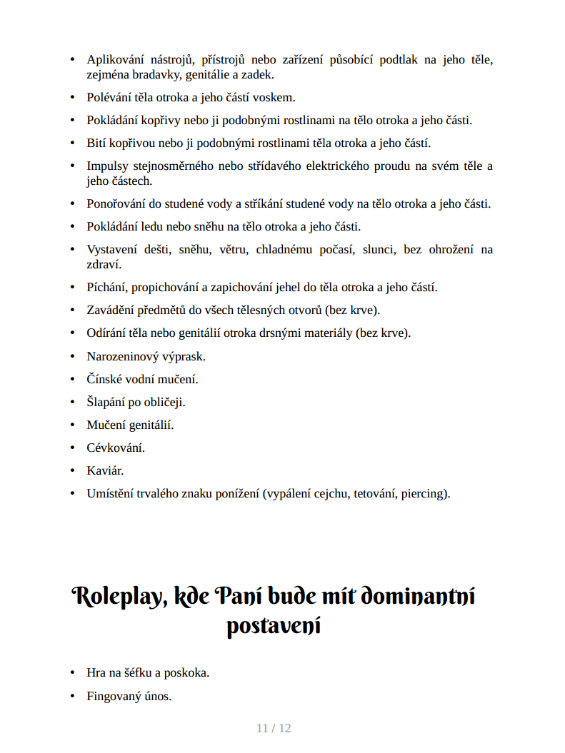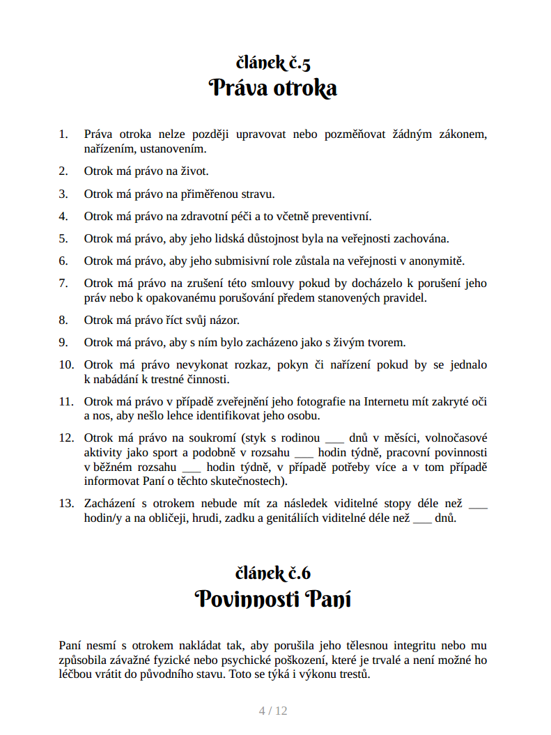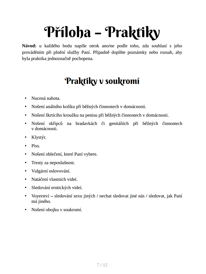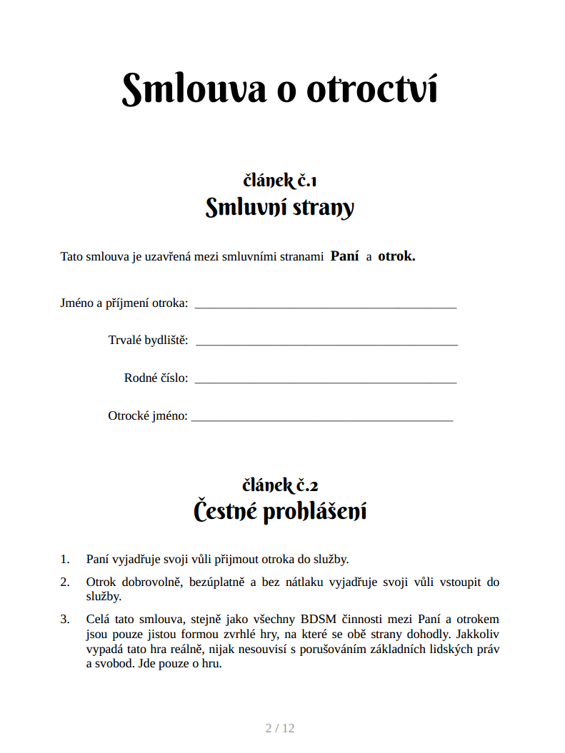 Ve smlouvě jsou definována práva a povinnosti Paní i otroka v základním smyslu klasického D/s vztahu. Součástí smlouvy je rozsáhlá variabilní část – seznam praktik, kterým svůj vztah nastavíte libovolně drsně či mírně.