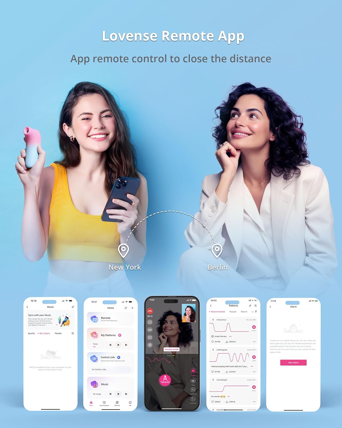 V sekci Long Distance můžete přenechat ovládání hračky svému partnerovi, chatovat s ním, vyměňovat si fotky či videa nebo vyzkoušet sex na dálku – buď si vzájemně ovládáte svoje hračky, nebo přenecháte ovládání obou hraček jednomu z vás.