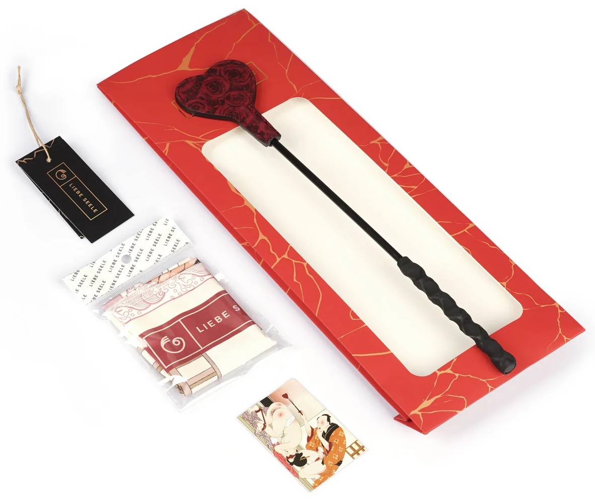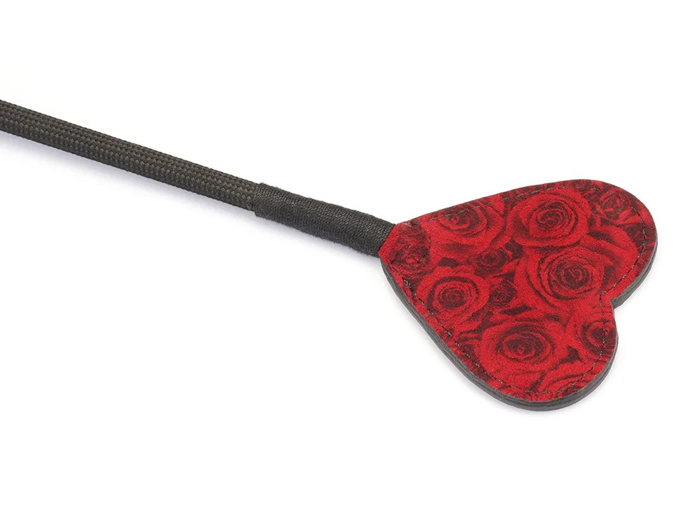 Bičík Red Rosy je ohebný a zakončený plácačkou z jehněčí kůže s potiskem s motivem růží, která při dopadu na kůži hezky štípne.
