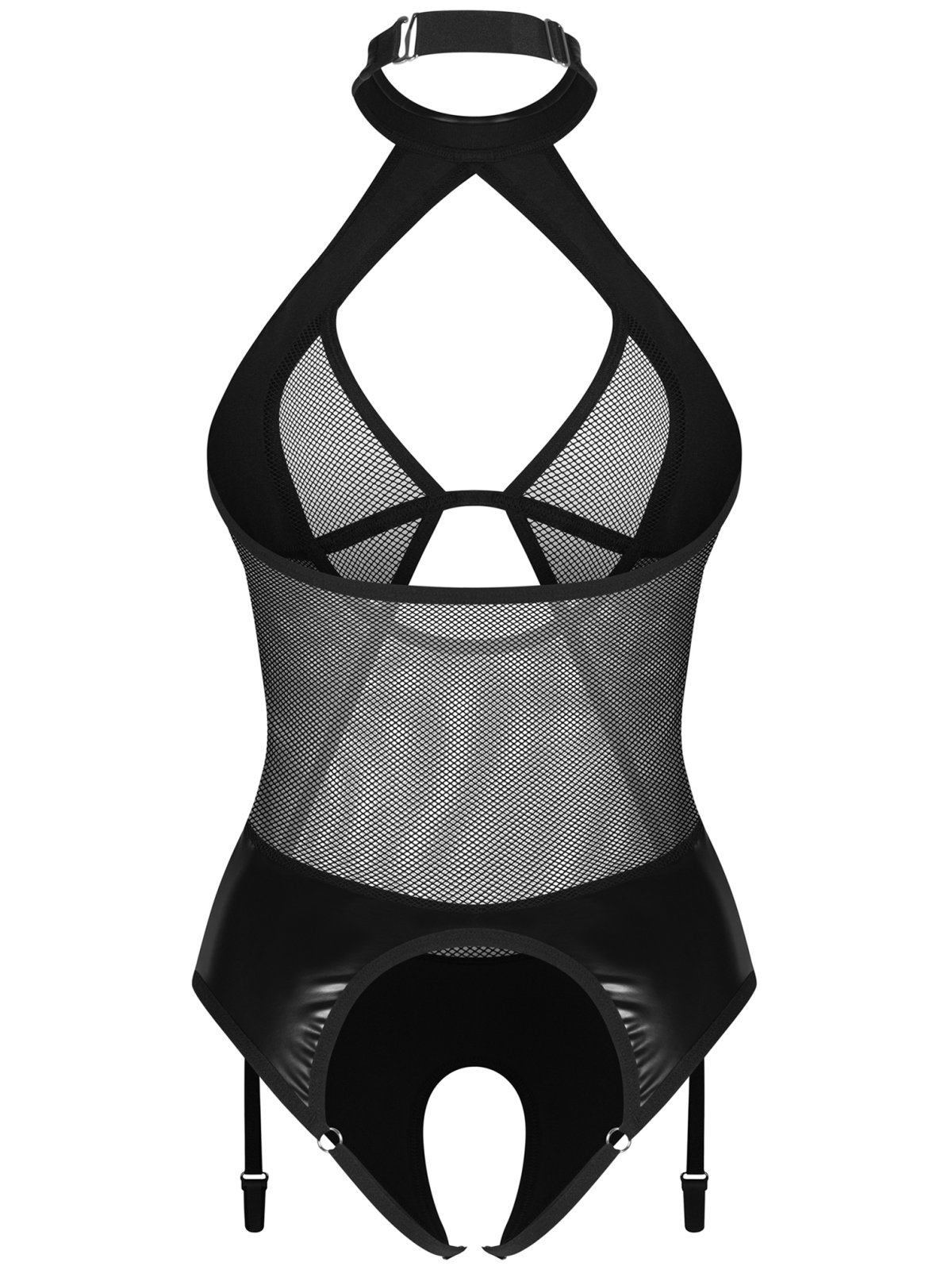 Místo ramínek má ozdobný obojek ze zapínáním na sponu. Má odhalená záda a 2 podvazkové pásky pro připnutí punčoch. Pásky jsou délkově nastavitelné.