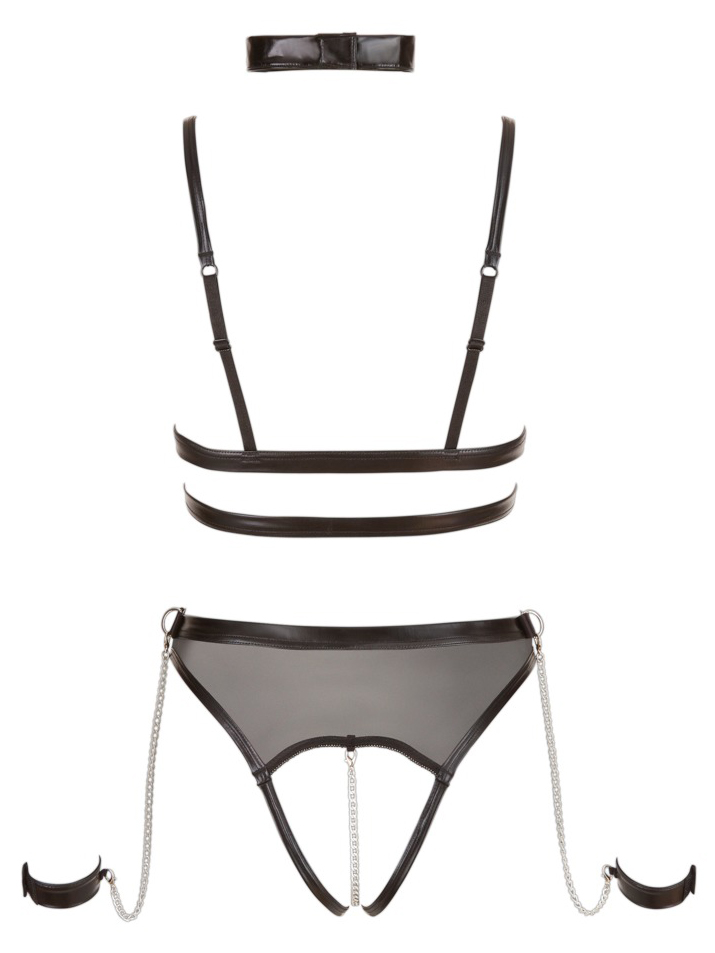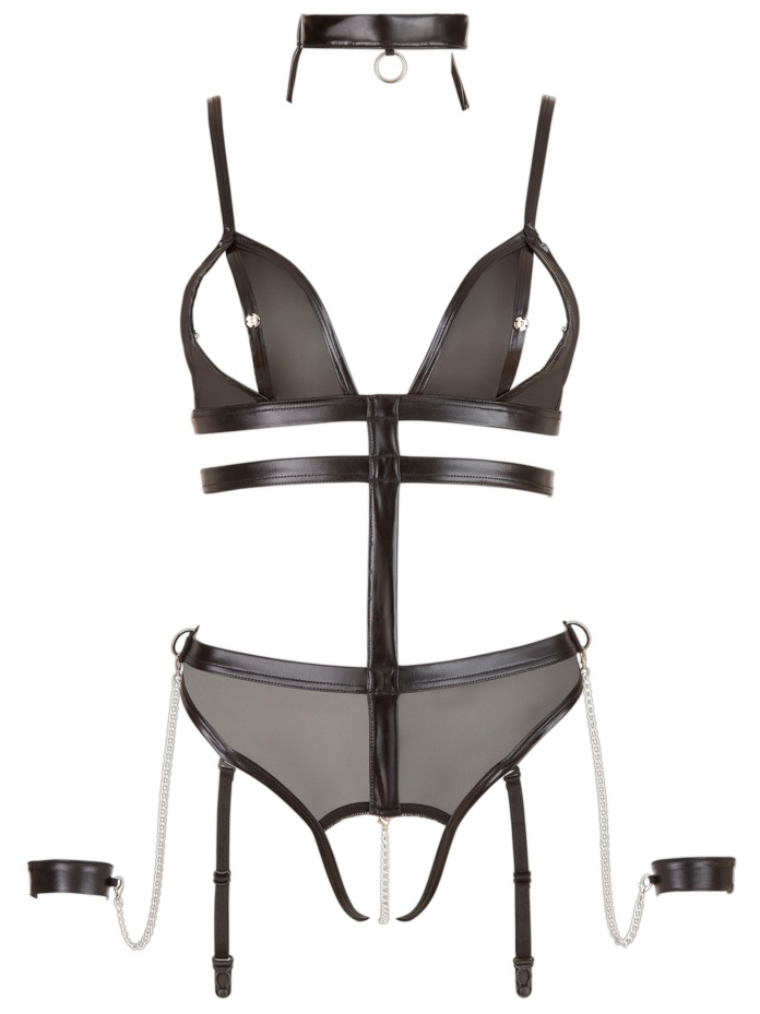 Body s řetízkem v rozkroku a s otvory na prsou + obojek a pouta Cottelli BONDAGE
