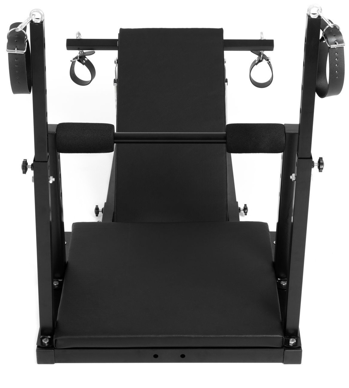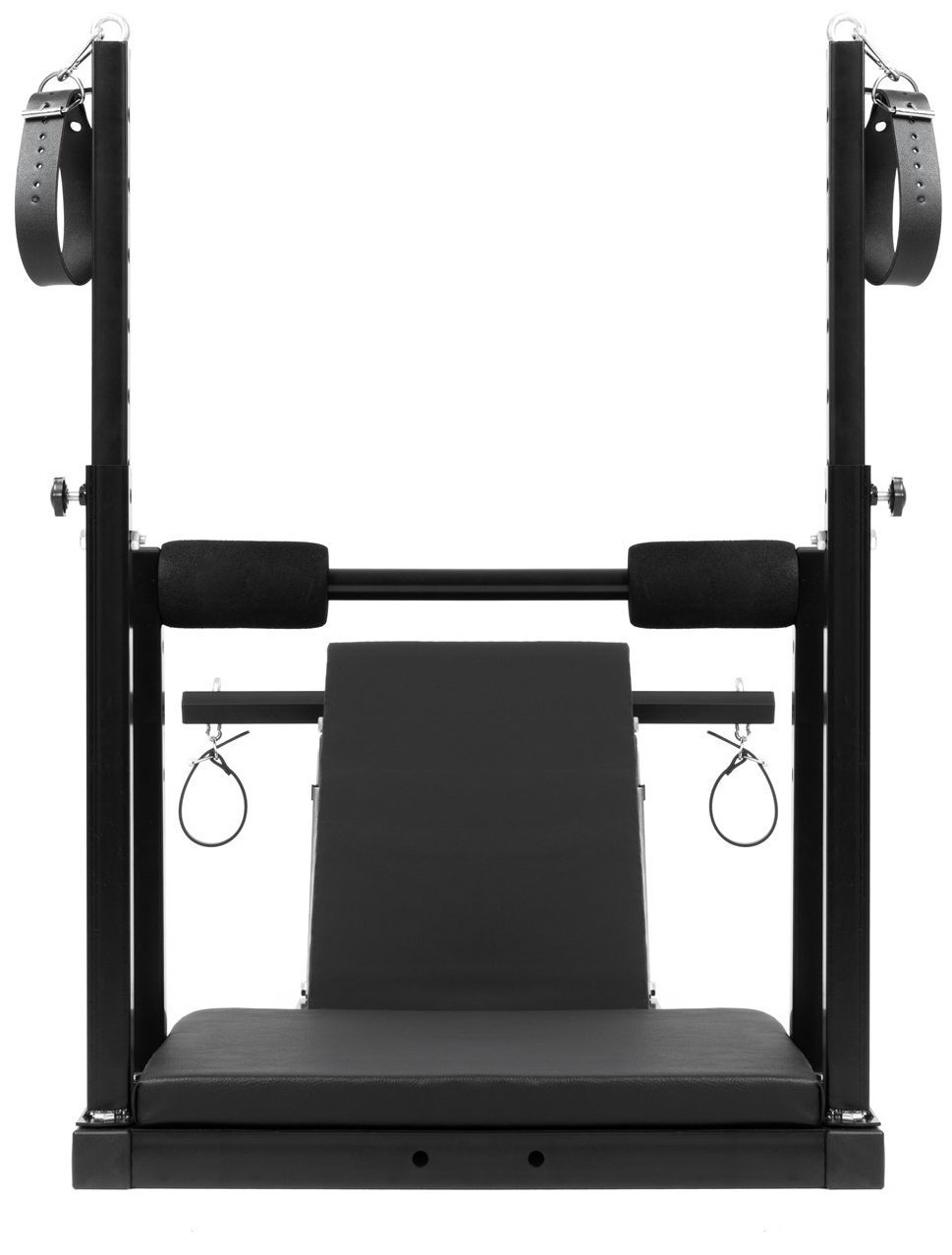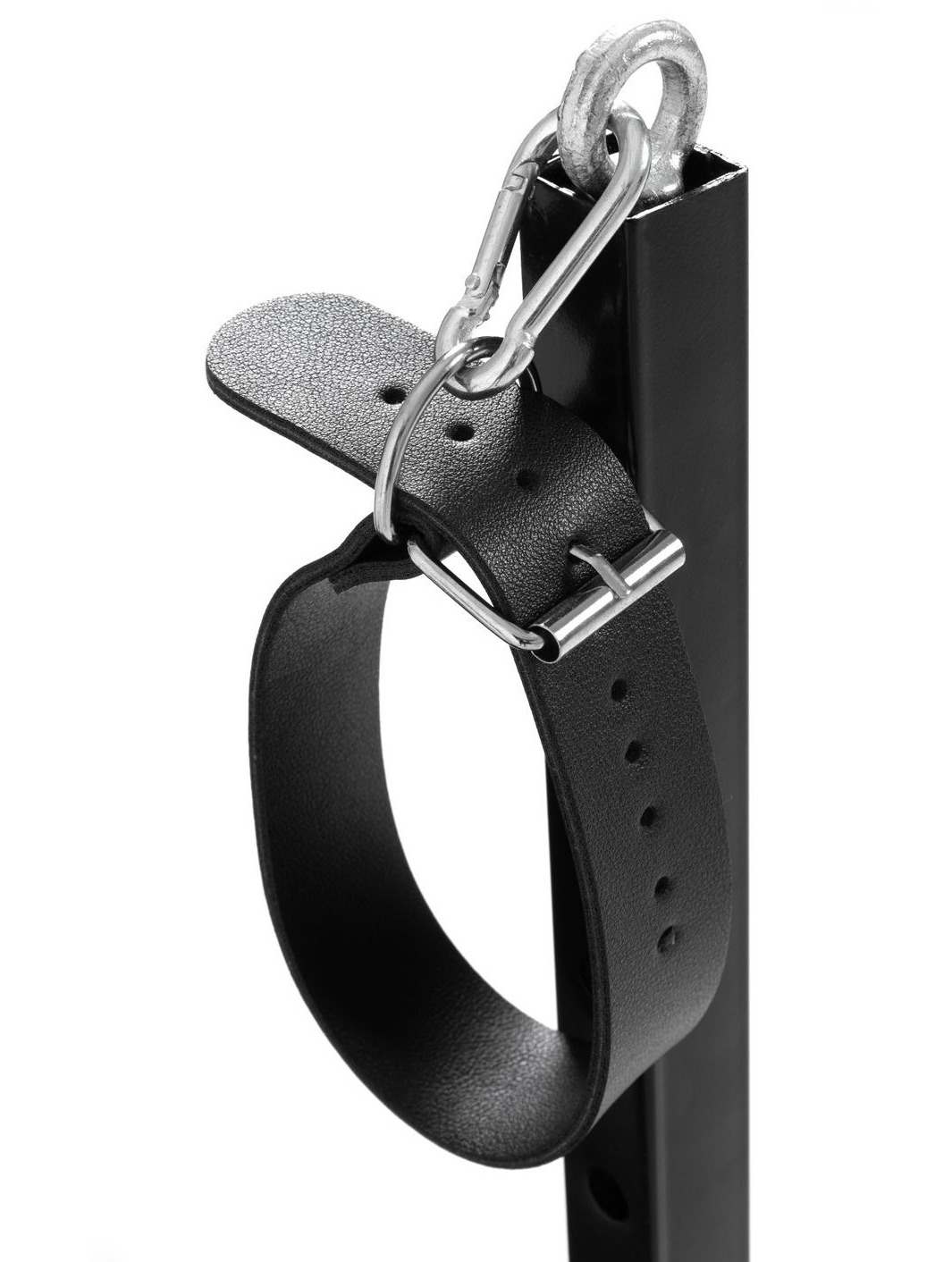 Pouta na ruce i nohy mají zapínání na přezku, takže snadno přizpůsobíte jejich velikost. Ke křeslu jsou připevněna pomocí karabin – můžete je odepnout a využít i samostatně, případně připnout k jiným BDSM pomůckám.