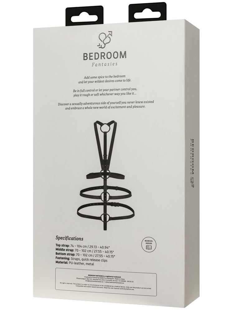 Bondage postroj slouží pro jednoduché přivázání rukou k tělu a jejich znehybnění. Je vyrobený z umělé kůže a kovových doplňků.