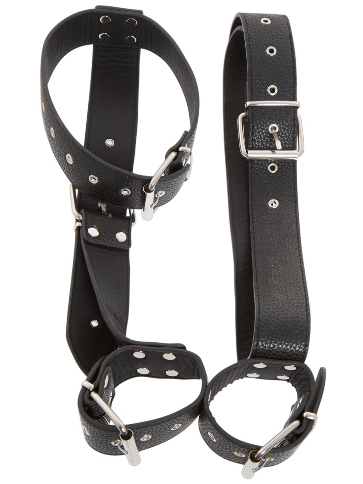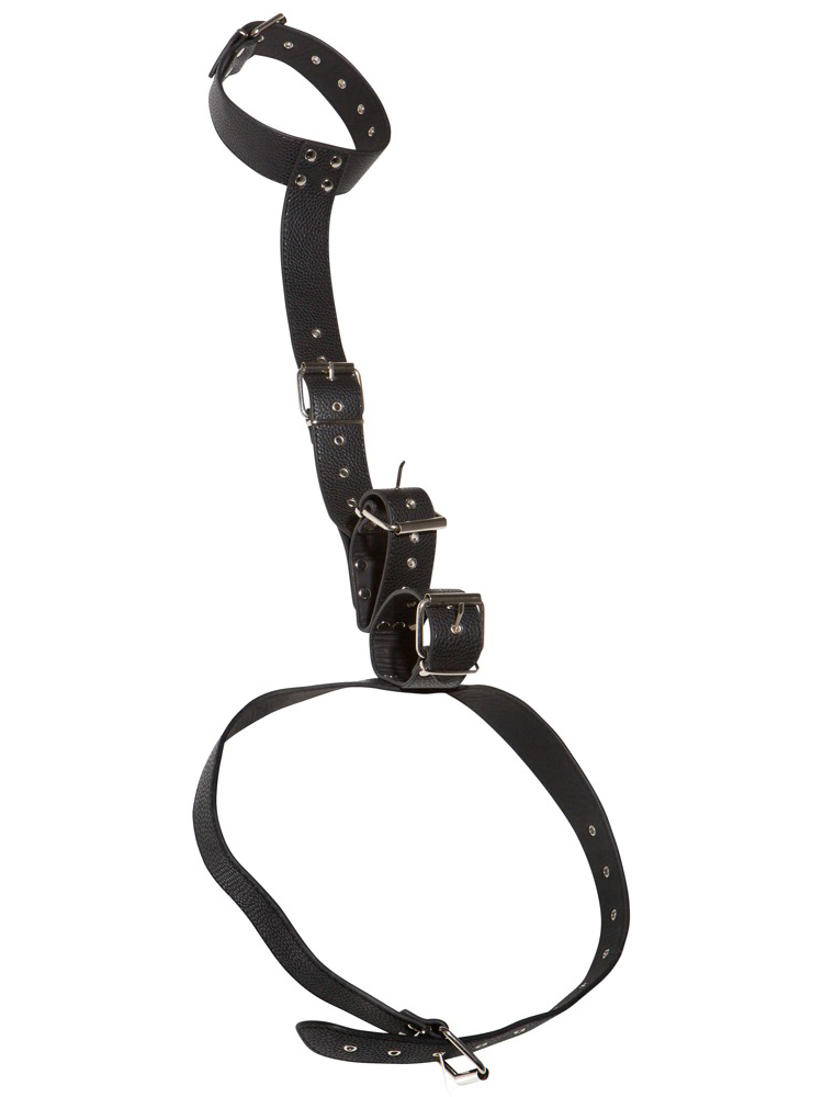 Postroj se skládá z několika popruhů, které tvoří pouta na ruce, obojek a spojovací pás. Jak moc partnerovi jednotlivé popruhy utáhnete už je pouze na vás.