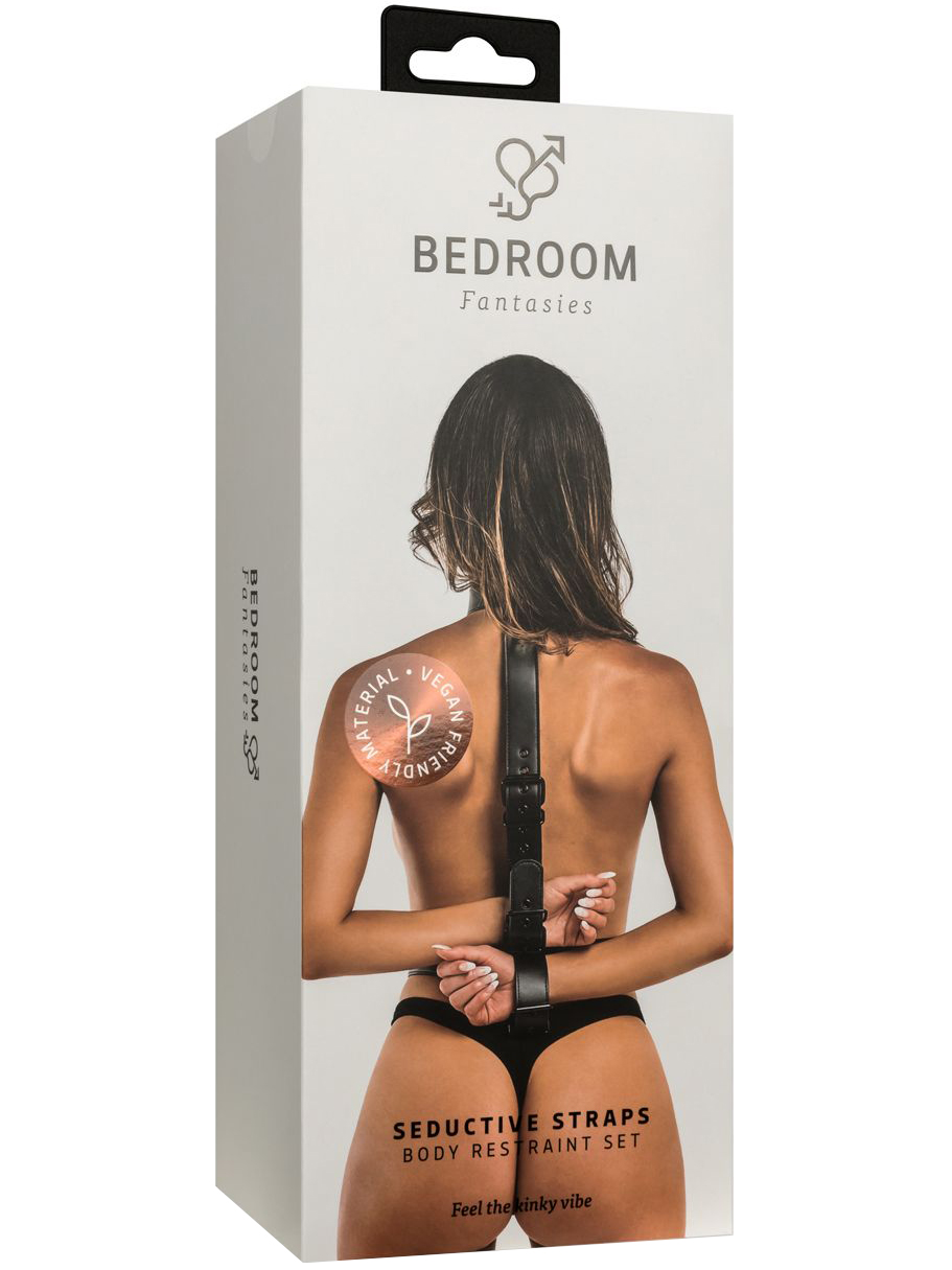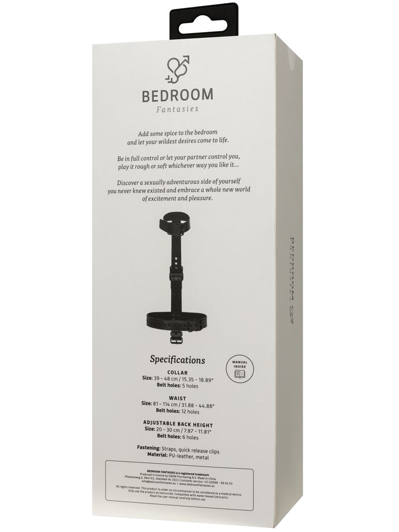 Postroj se skládá z obojku, popruhu kolem pasu a středového popruhu s pouty. Ruce můžete spoutat buď na břiše, nebo na zádech – záleží na tom, jak postroj nasadíte.