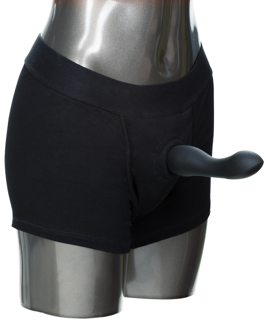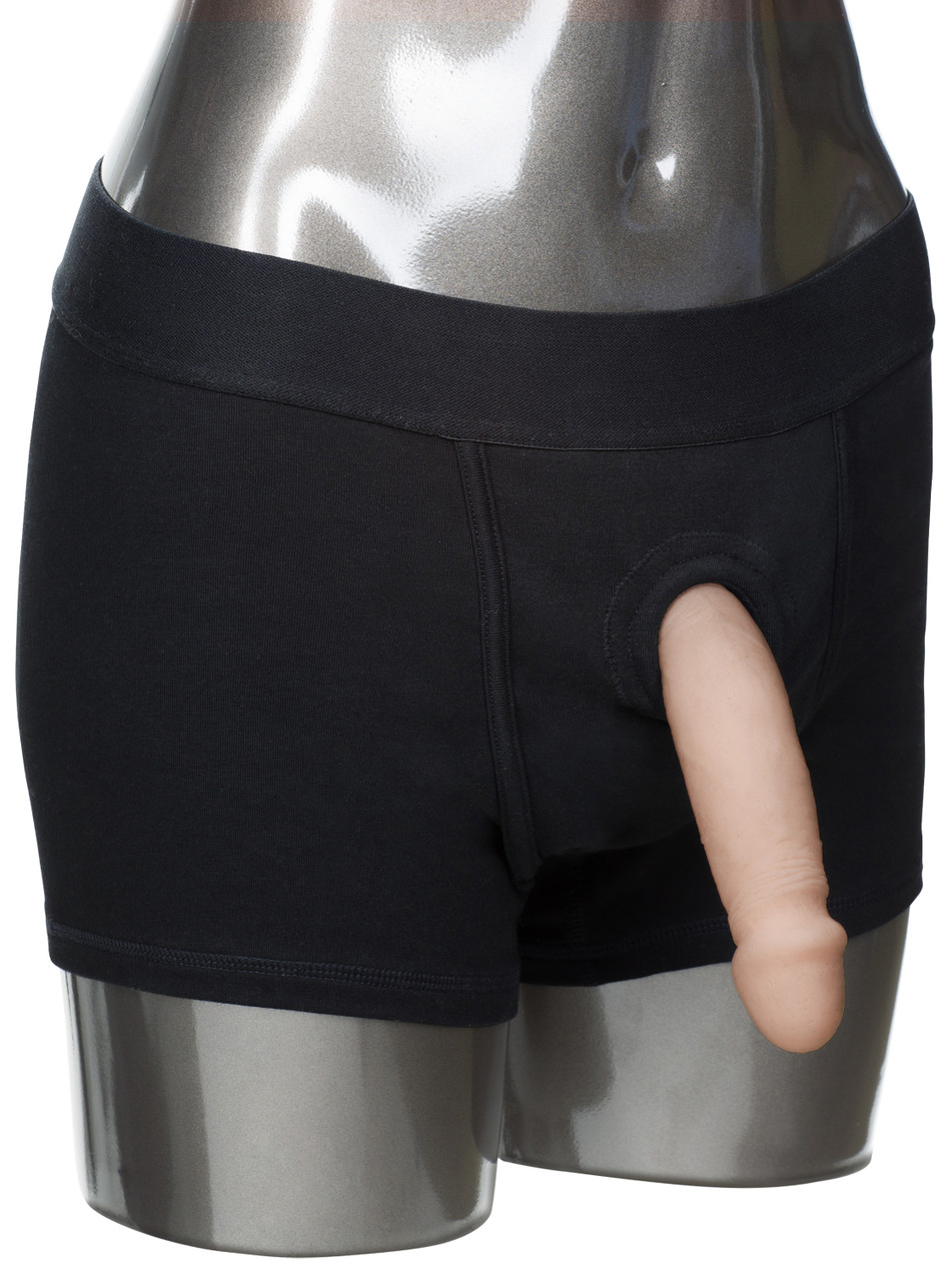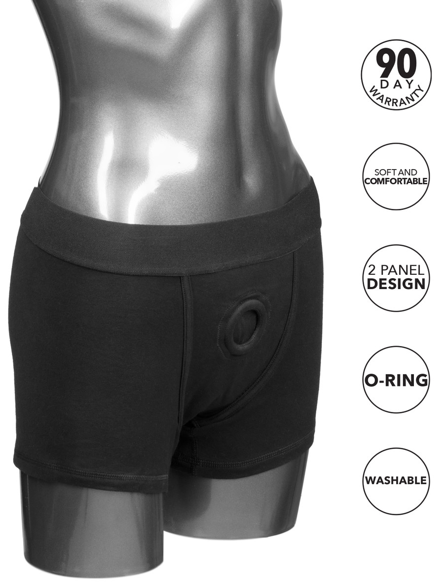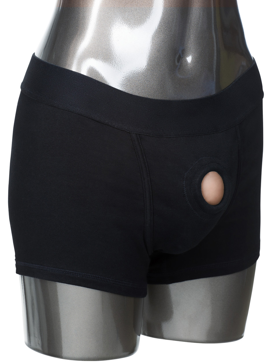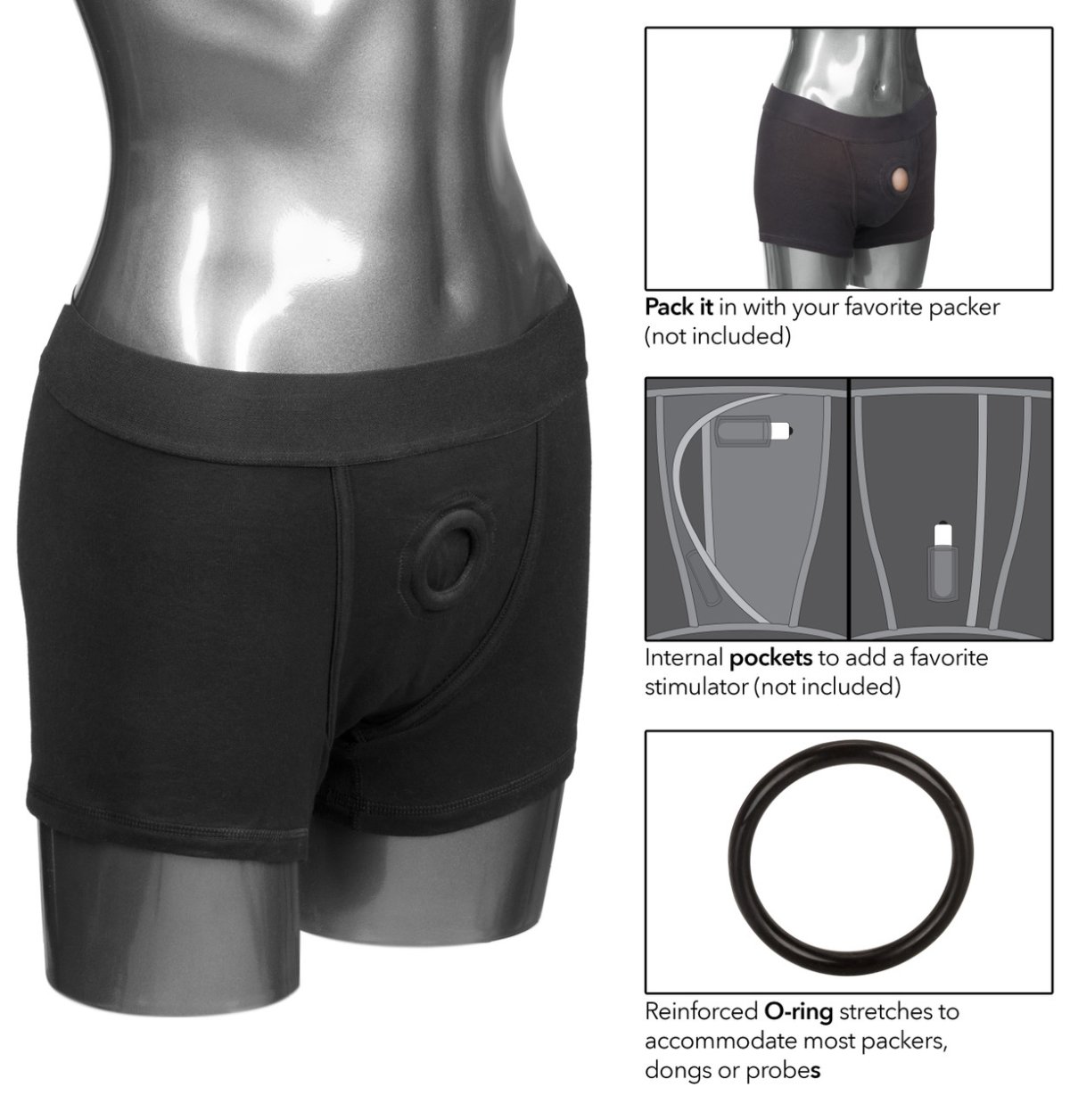 Boxerky mají O-kroužek, do kterého upnete výplňový penis, vibrátor nebo dildo s přísavkou. Jsou ušity z látky příjemné na dotek a mají širokou elastickou gumu pro pohodlné nošení.