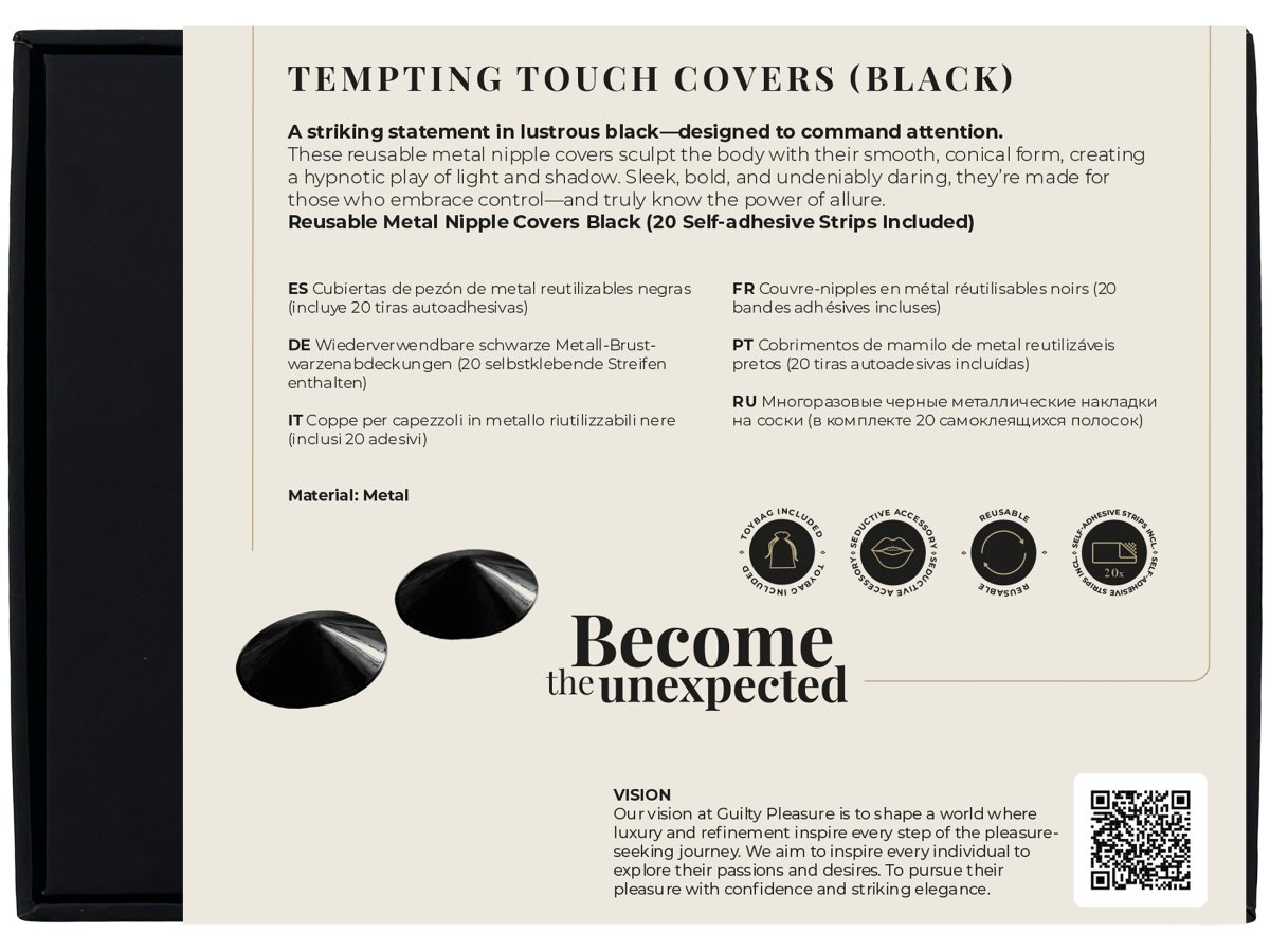 Samolepky z leskle černého kovu poslouží jako ozdoba nahého těla či jako doplněk erotického prádla. Krásně se vyjímají i pod průsvitnou látkou.