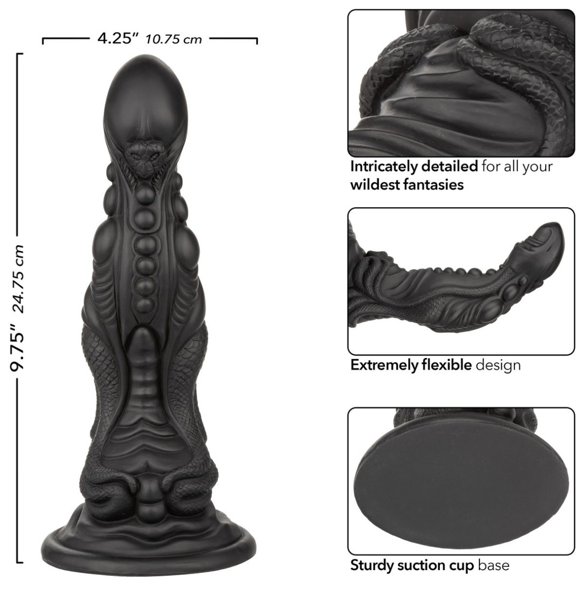 - Rozměry: celková délka 24,8 cm (včetně přísavky), zasunutelná délka cca 23 cm, průměr 4,4 – 7,5 cm, průměr přísavky 10,8 cm