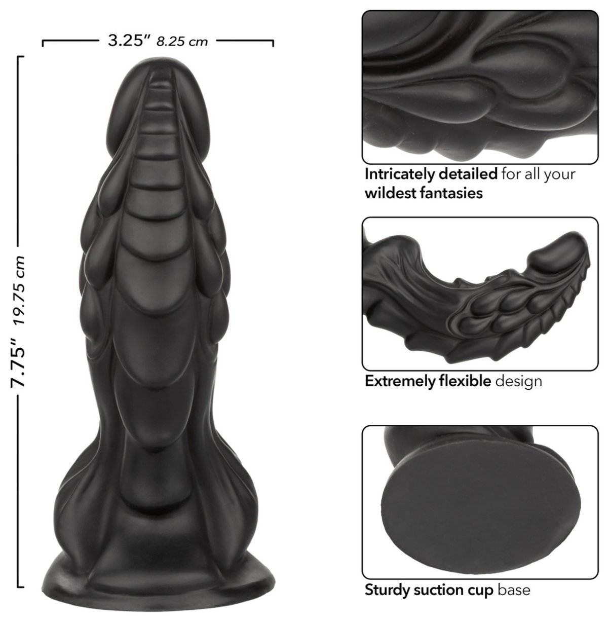 - Rozměry: celková délka 19,8 cm (včetně přísavky), zasunutelná délka cca 15,5 cm, průměr 3,5 – 6 cm, průměr přísavky 8,3 cm
