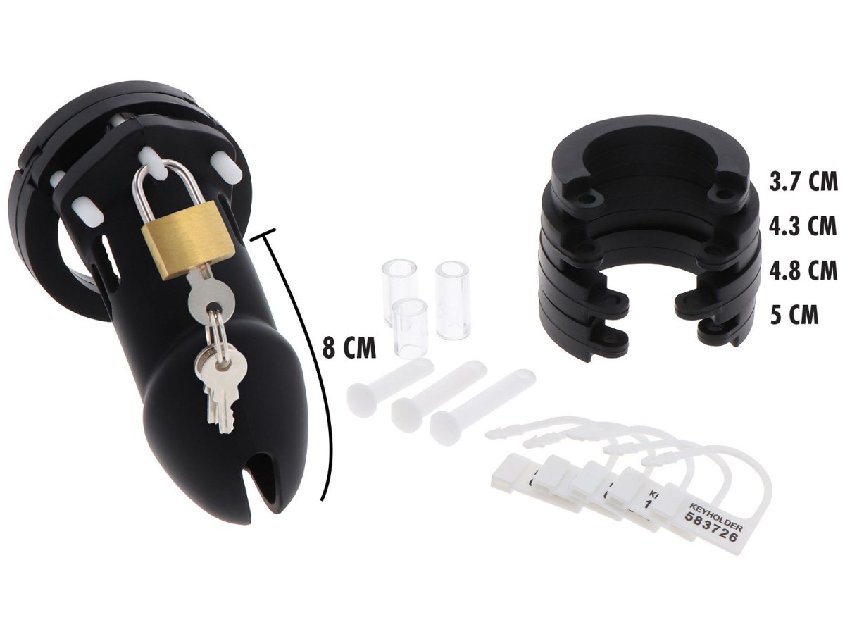 Na svém místě drží klec díky kroužku na varlata – v balení najdete hned 5 kroužků o různém průměru. Varlatům tak dopřejete větší či menší svobodu a pohodlí podle potřeby.