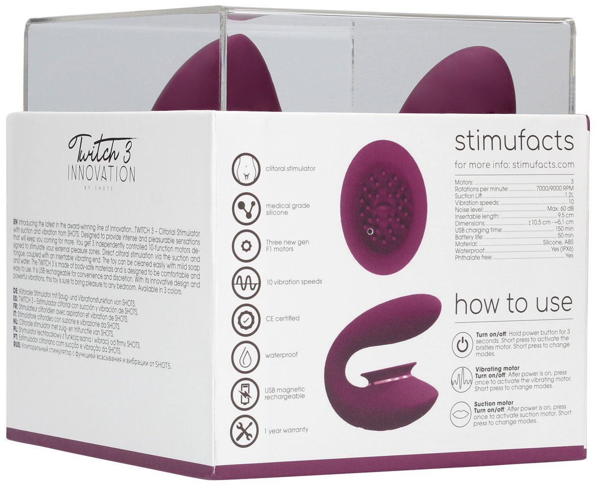 Vibrátor Twitch 3 stimuluje vibracemi bod G a klitoris najednou. Klitoris navíc potěší sáním, měkkými stimulační výstupky a hbitým jazýčkem.