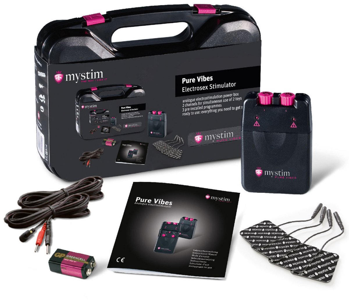 - Obsah balení: analogový zdroj, 4 přilnavé obdelníkové elektrody, 2 kabely bipolární pro připojení elektrod, 9 voltovou baterii, praktický kufřík, návod k použití