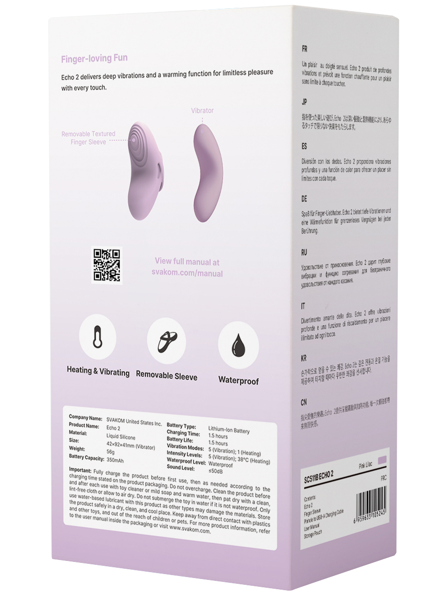 Hřejivý vibrátor na prst Svakom Echo 2 je lehký, malý a snadno se s ním manipuluje. Má odnímatelný návlek s poutkem na prst pro ještě jednodušší používání a lze ovládat mobilem.