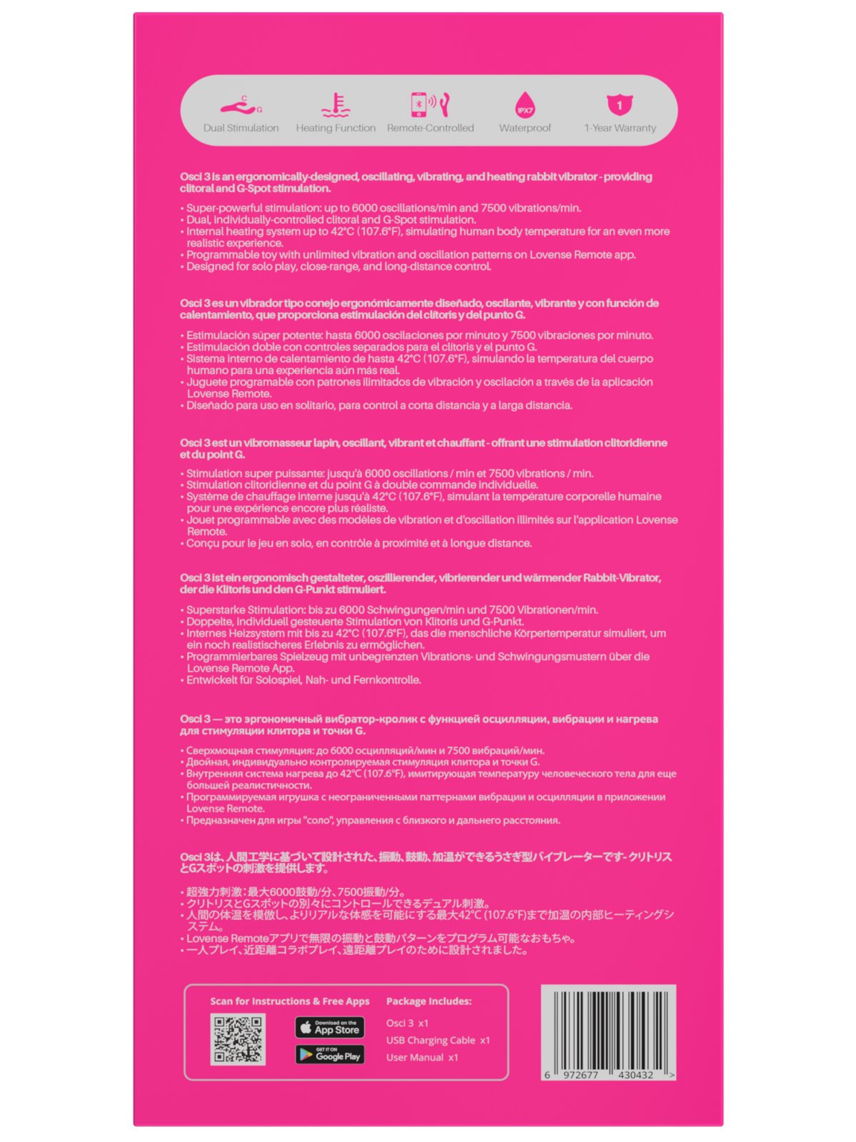 Interaktivní vibrátor Osci 3 promasíruje bod G intenzivní pulzací a provibruje klitoris extra silnými a hlubokými vibracemi. Lze ovládat mobilem a má nahřívací funkci.