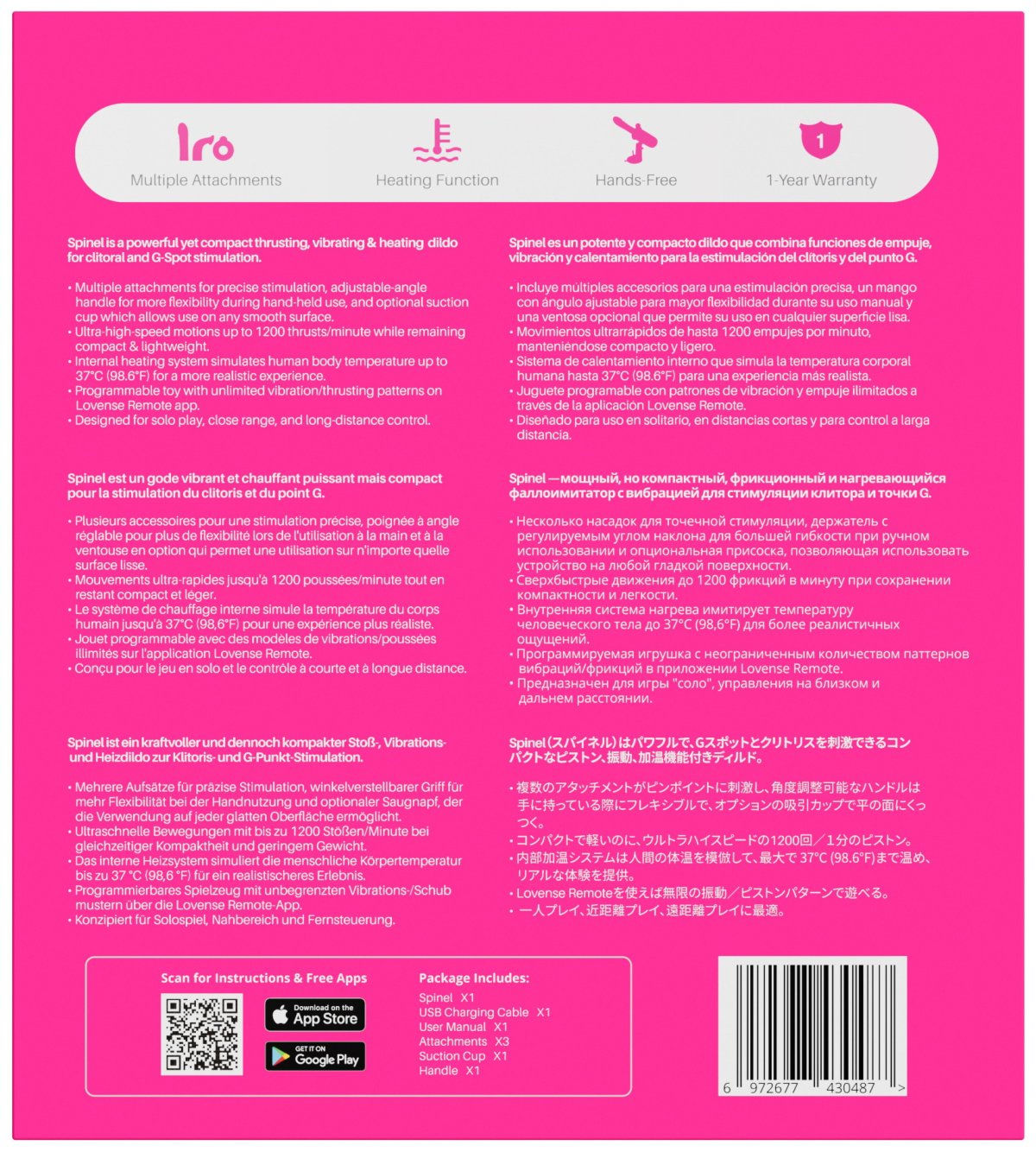 Rovný nástavec hřeje a vibruje a má drážkovaný povrch pro intenzivnější stimulaci, zahnutý nástavec je tvarovaný pro vyvinutí většího tlaku na bod G a zesílení prožitku (nevibruje). Oba nástavce pak můžete doplnit kroužkem pro vnější stimulaci s výstupkem na klitoris.