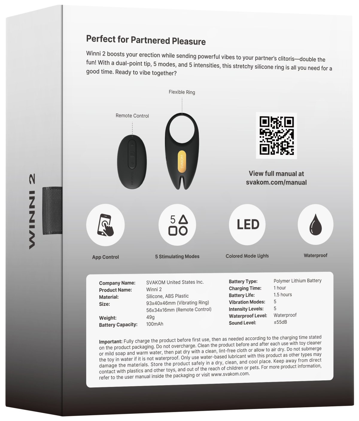 Je voděodolný (pro hrátky ve sprše) a vyrobený ze silikonu, který je bezpečný pro lidské tělo a příjemný na omak. Nabíjí se USB kabelem.