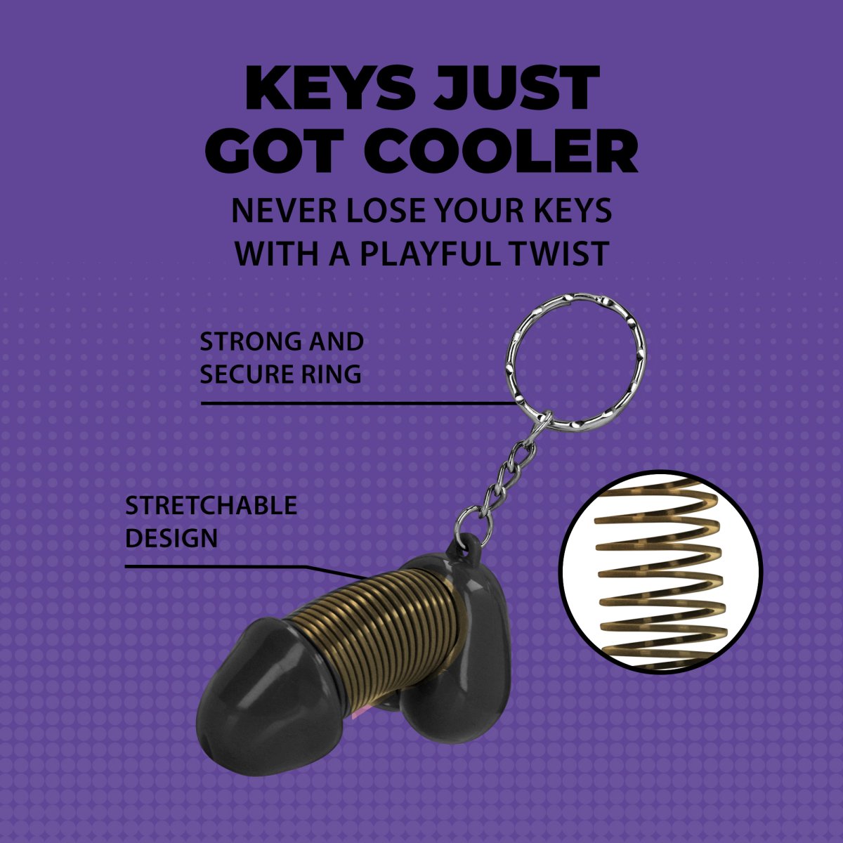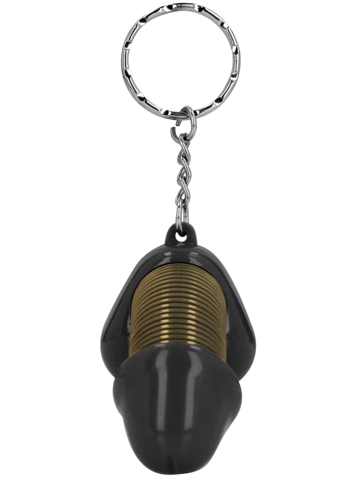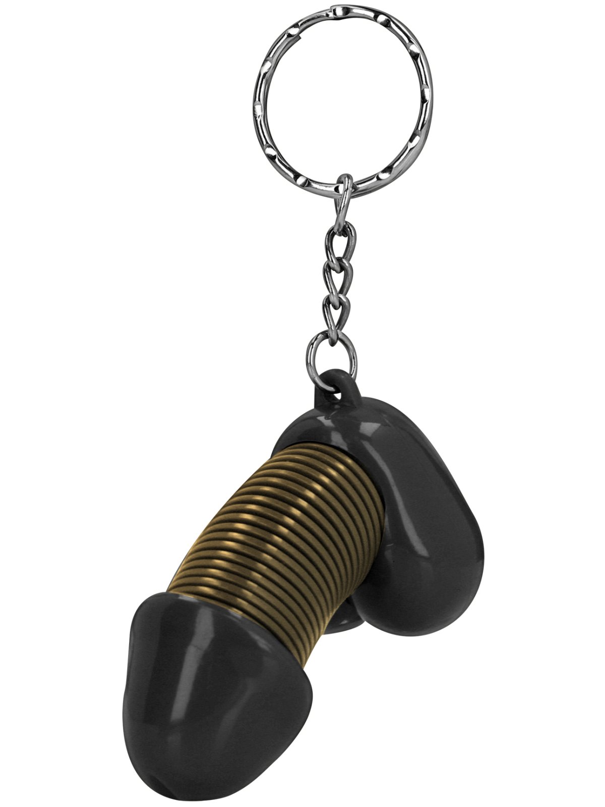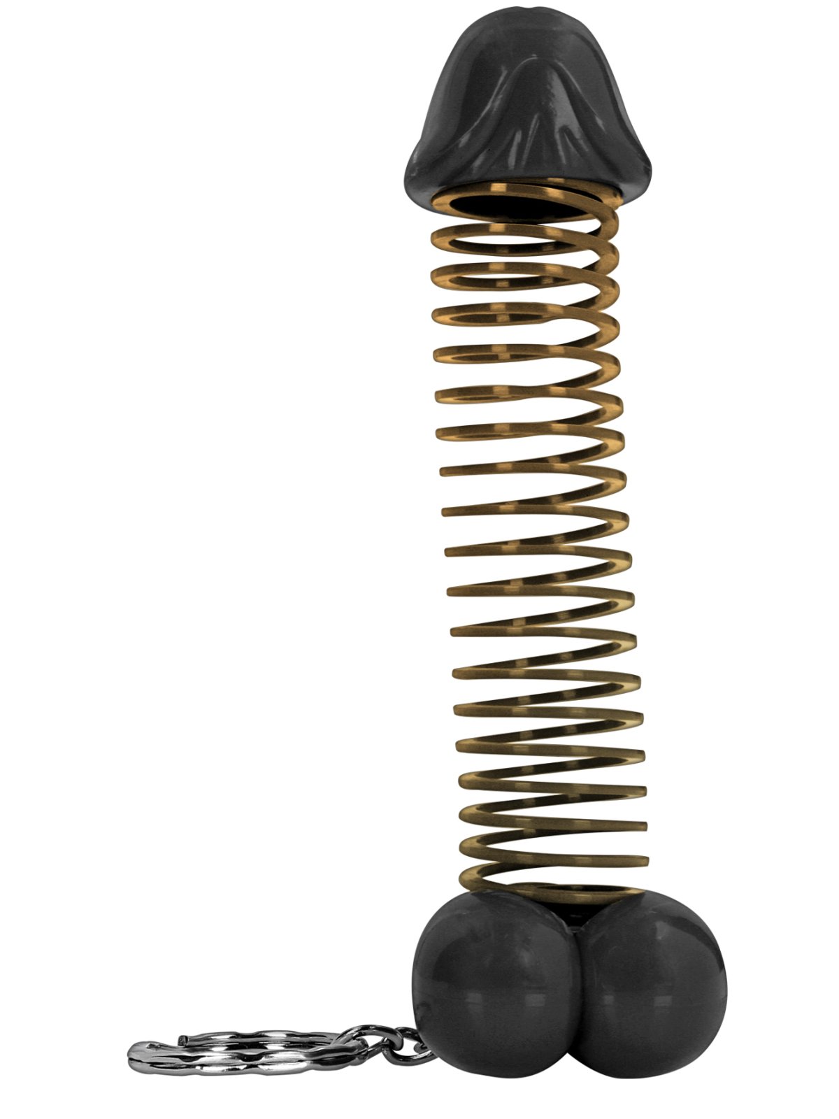 Klíčenka má tvar penisu a kroužek na pověšení. Díky pružince mezi žaludem a varlaty se penis vtipně pohupuje a můžete ho i natahovat.