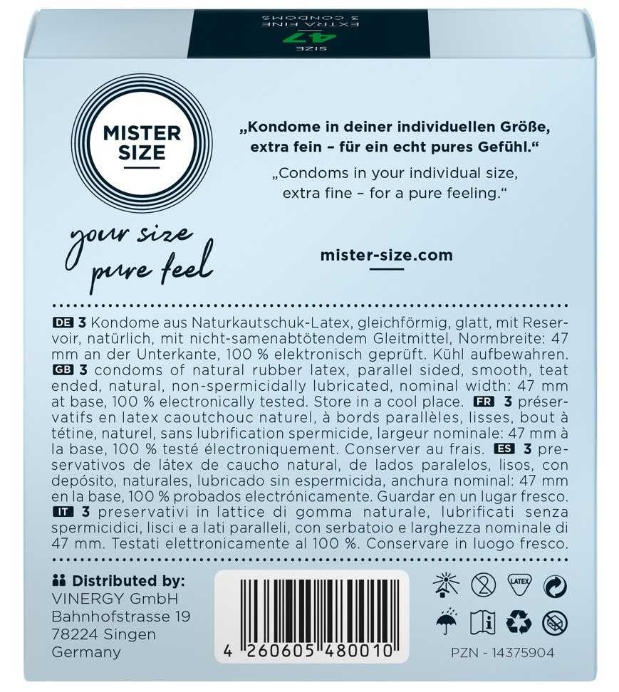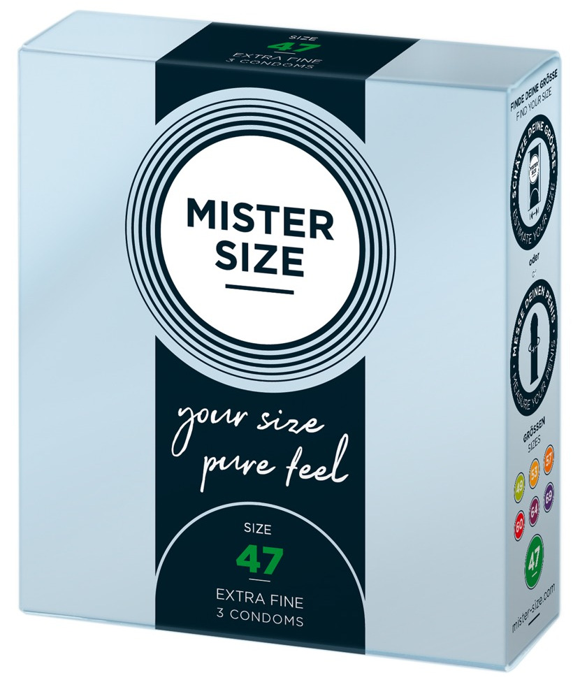Kondomy MISTER SIZE 47 mm jsou určeny pro muže s průměrem penisu 3–3,2 cm. Díky tloušťce pouhých 0,05 mm je téměř neucítíte – budou jako vaše druhá kůže.