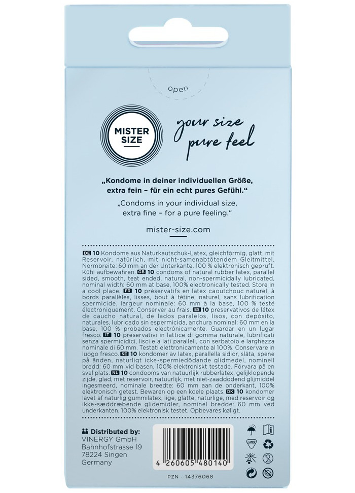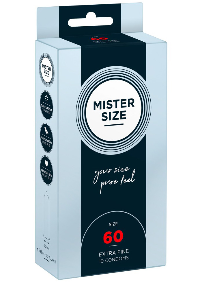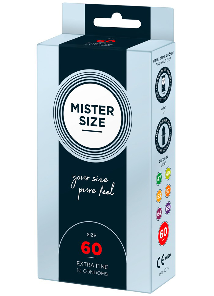 Kondomy MISTER SIZE 60 mm jsou určeny pro muže s průměrem penisu cca 4,3–4,6 cm. Díky tloušťce pouhých 0,05 mm, je téměř neucítíte – budou jako vaše druhá kůže.