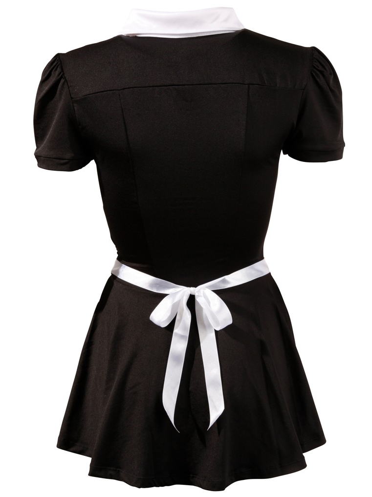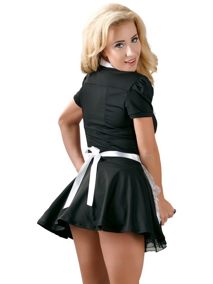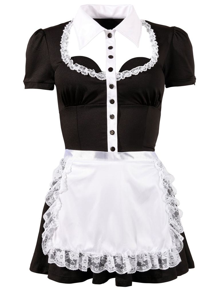 Kostým se skládá z černých minišatů s hlubokým výstřihem a bílým límečkem a zástěry s krajkovým lemem. Minišaty jsou ušité z elastické látky příjemné na dotek.