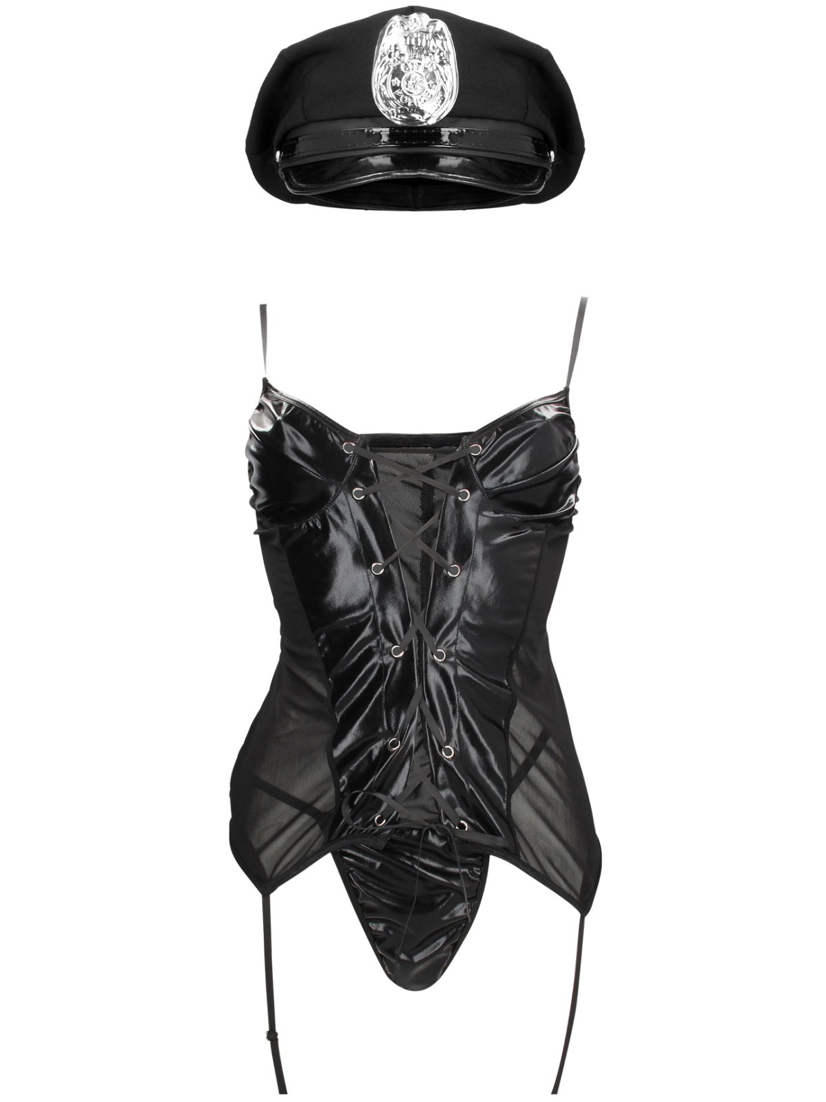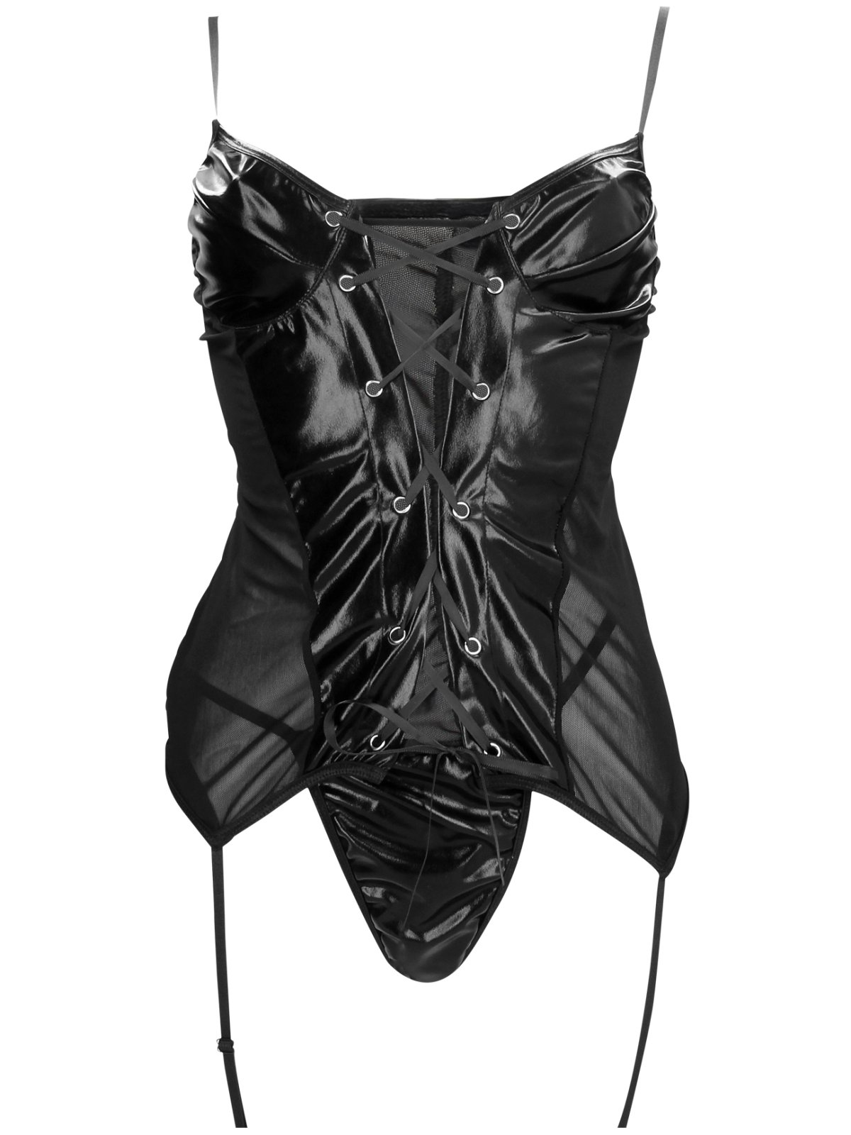 Top je ušitý z kombinace wetlook a průsvitné látky a má funkční šněrování pro úpravu velikosti a délkově nastavitelná ramínka a 4 podvazkové pásky pro připnutí punčoch.