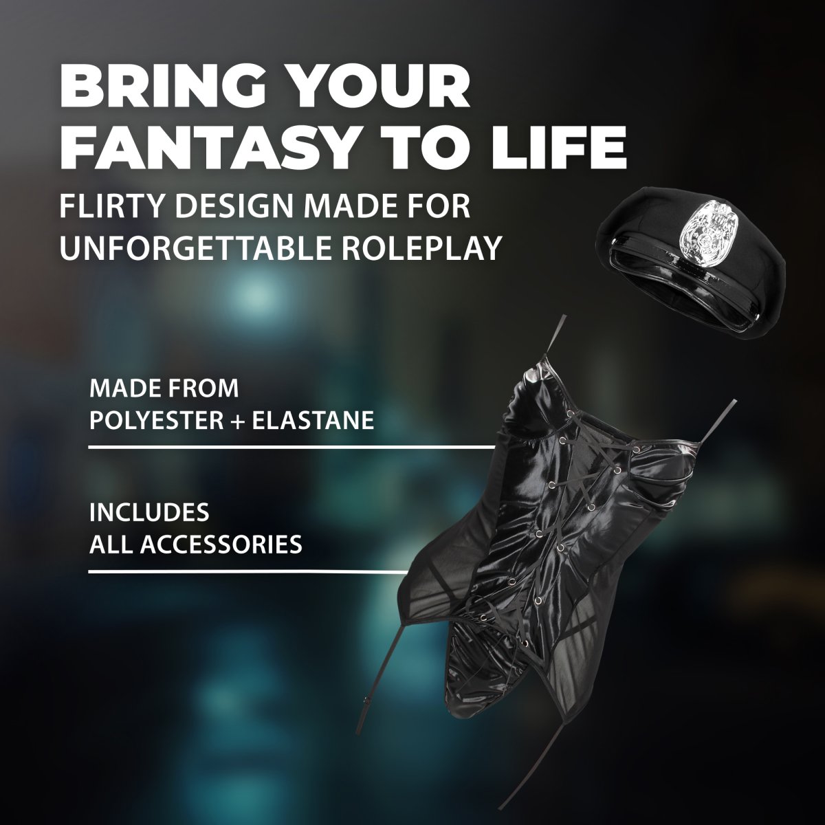 Kostým policistky tvoří top, tanga a policejní čepice. Je ušitý z měkké a elastické látky, takže si během role play her užijete dostatek pohodlí.