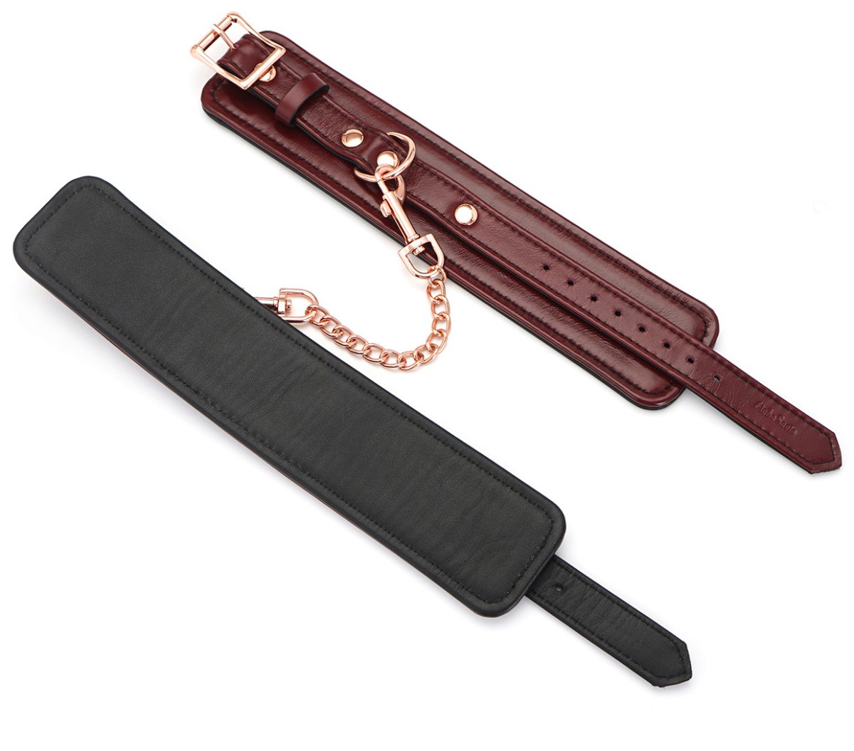 Jsou spojená řetízkem s karabinkami a mají zapínání na kovovou přezku.