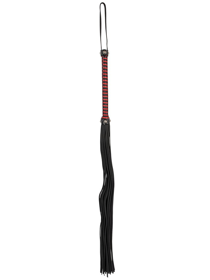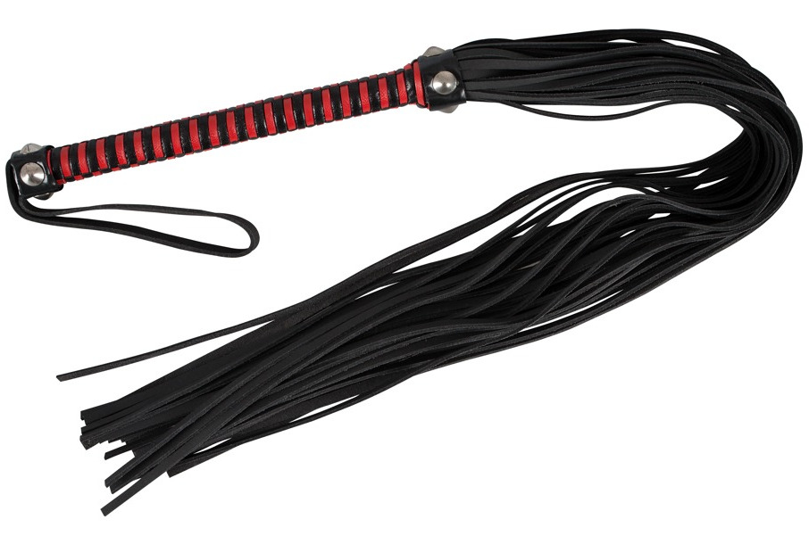 Dlouhé důtky se hodí na něžné i drsnější zacházení. Jsou vyrobeny z kombinace černé a červené kůže a rukojeť je na obou koncích ozdobena kovovými nýty.