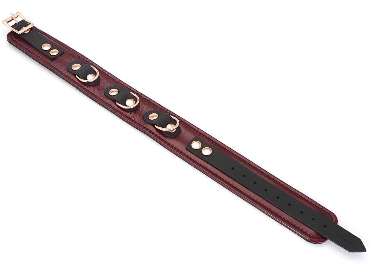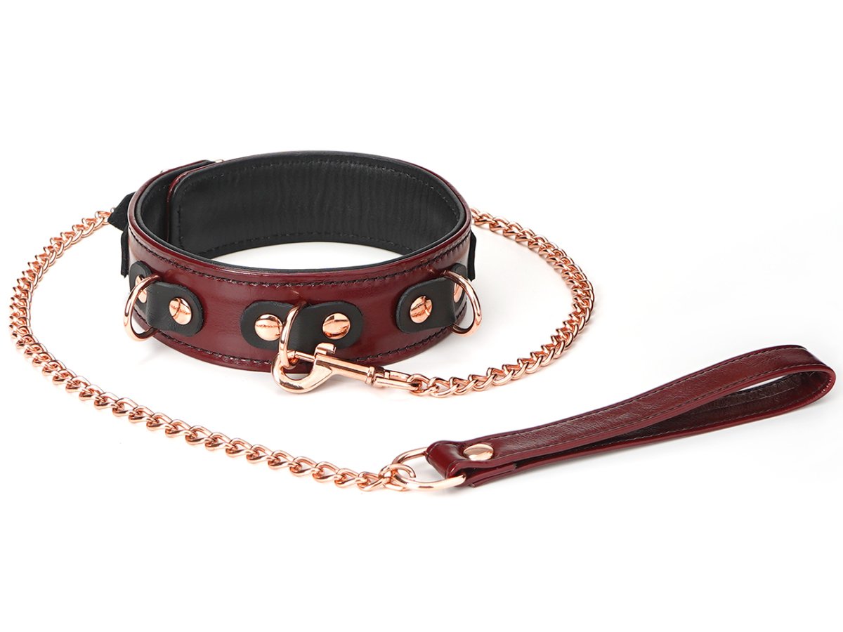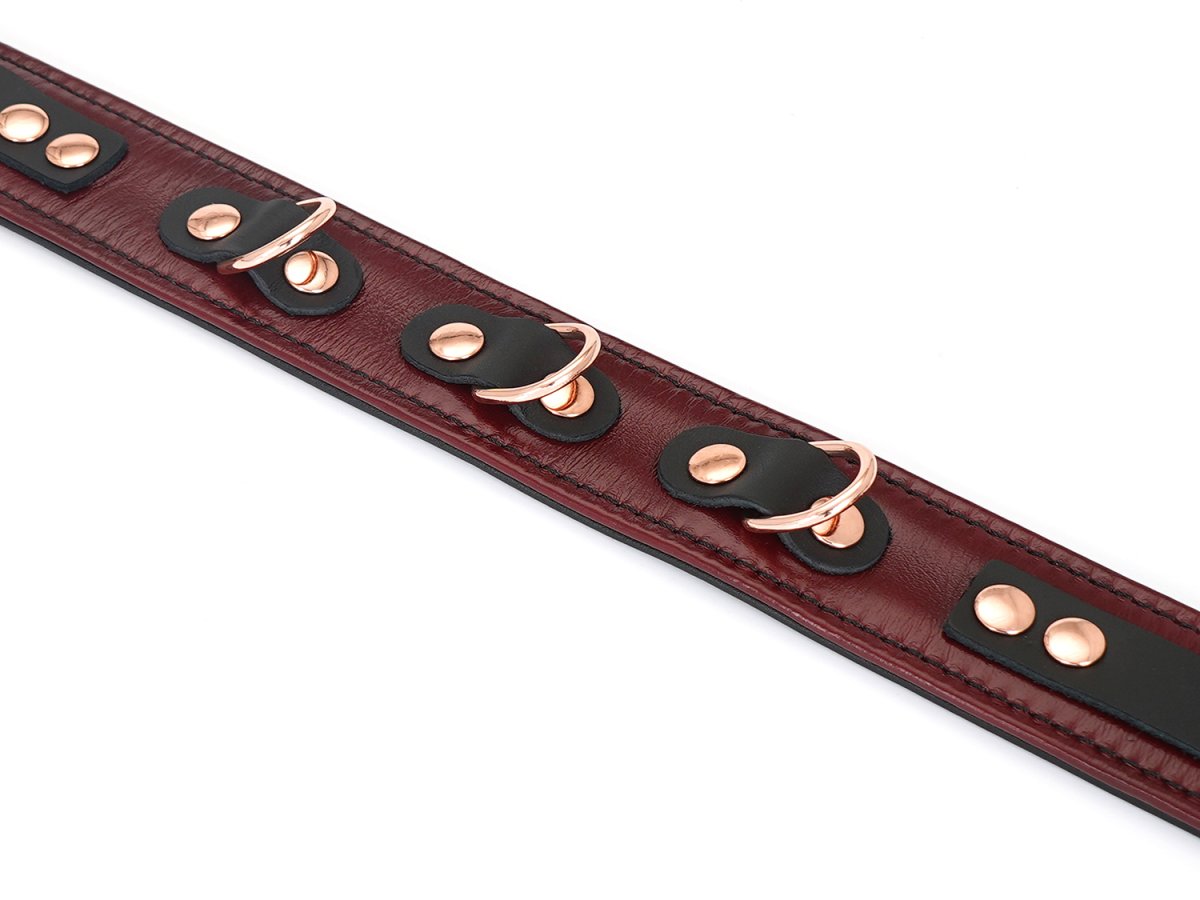Obojek i vodítko jsou vyrobeny z kombinace měkké pravé kůže v barvě červeného vína a kovu. Obojek je z vnitřní strany změkčený pro pohodlnější nošení.
