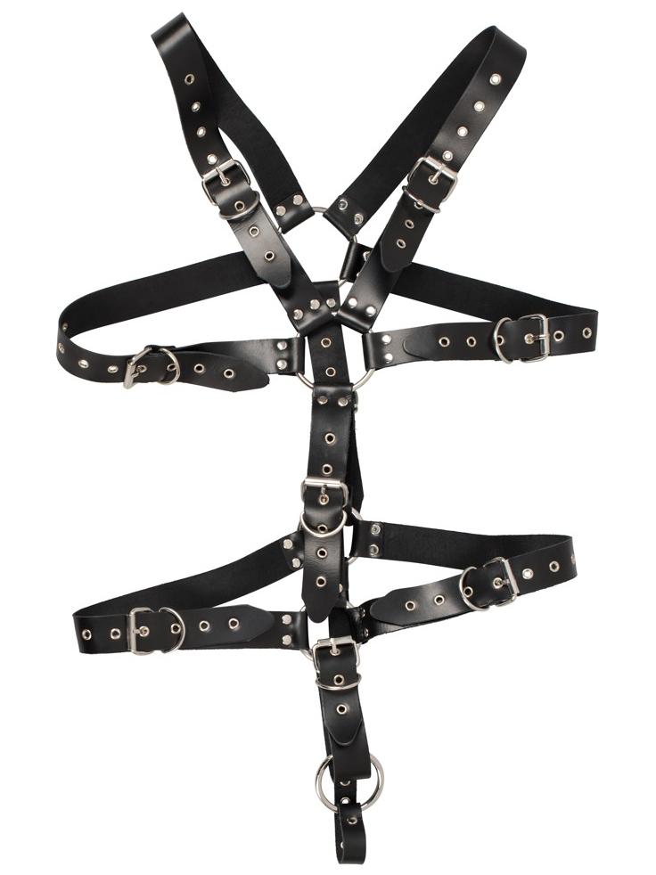Utažením nebo povolením přezek učiníte nošení řemínkového body více či méně pohodlným. Popruh v rozkroku je opatřen kroužkem na penis a varlata.