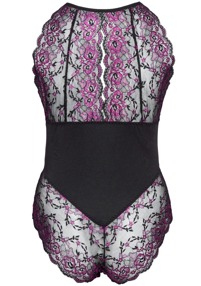 Body je ušito z průsvitné květinové krajky ve dvou barvách, která je měkká a elastická. Díky tomu se pohodlně nosí. Kolem pasu je neprůhledná vsadka, která opticky zmenší bříško.