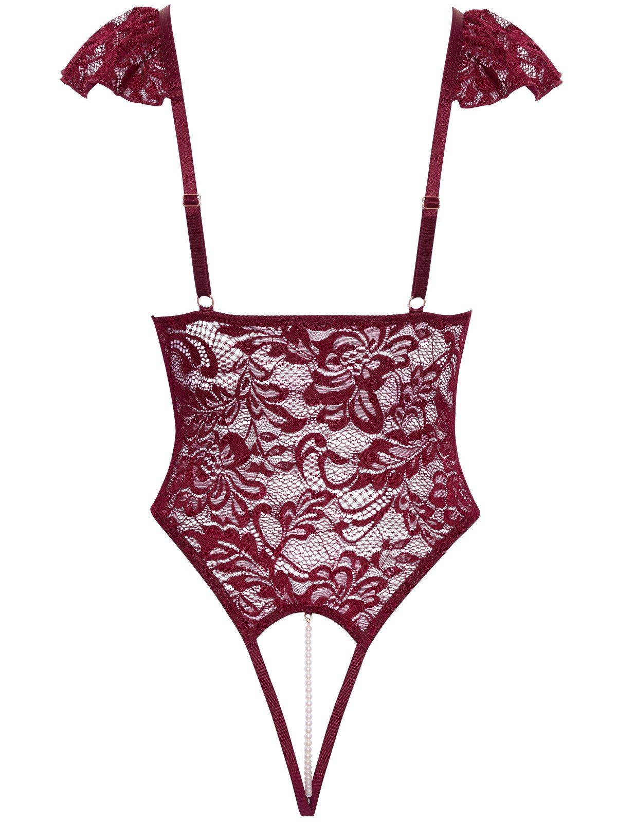 Má hluboký výstřih, délkově nastavitelná ramínka a otevřený rozkrok, který usnadňuje přístup k intimním partiím i zadečku. Perlové řetízky jde snadno odepnout.