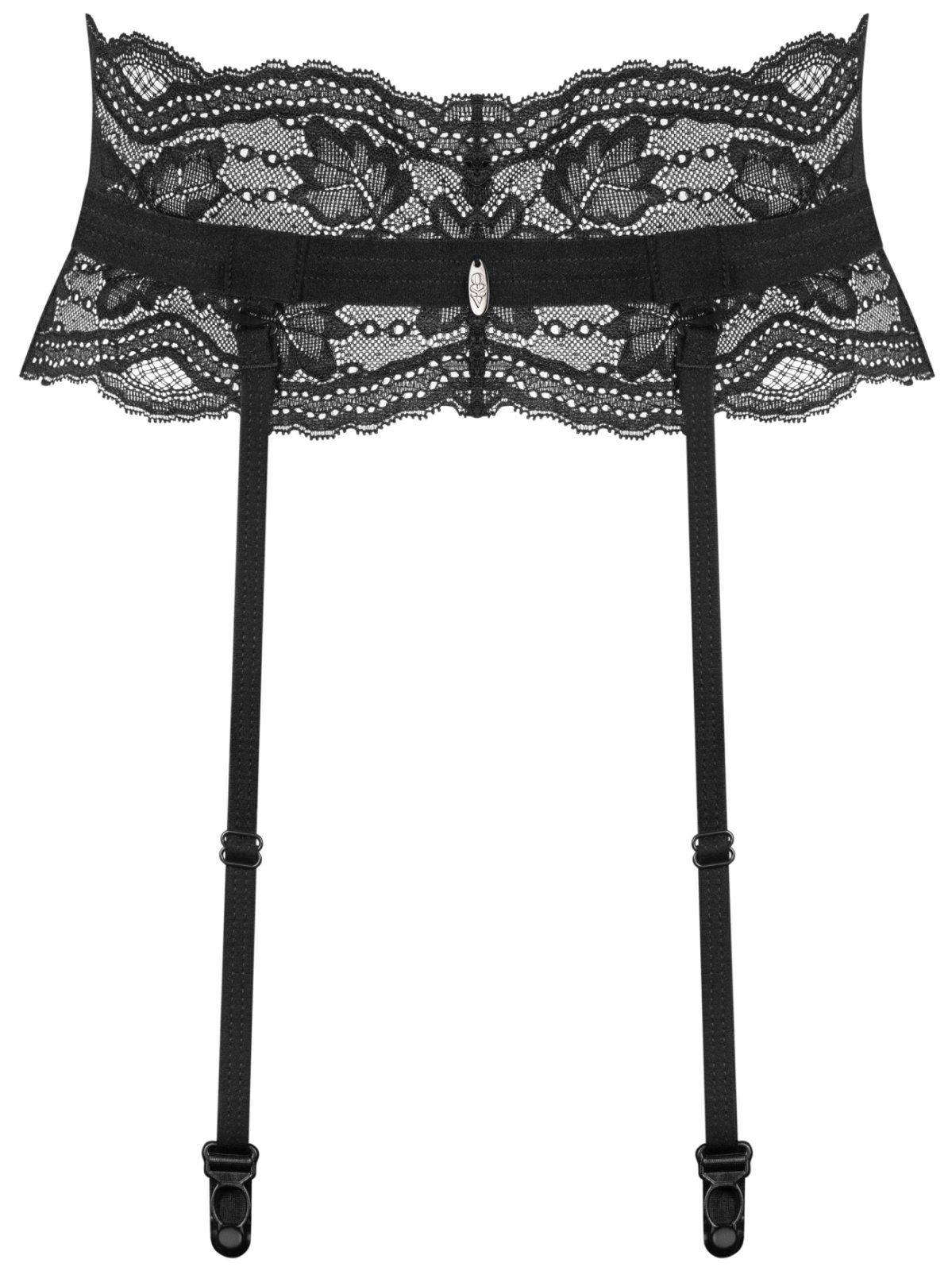 Podvazkový pás je ušitý z měkké a elastické průsvitné krajky, která se pohodlně nosí. Má 4 délkově nastavitelné podvazkové pásky a postupné zapínání na háčky.