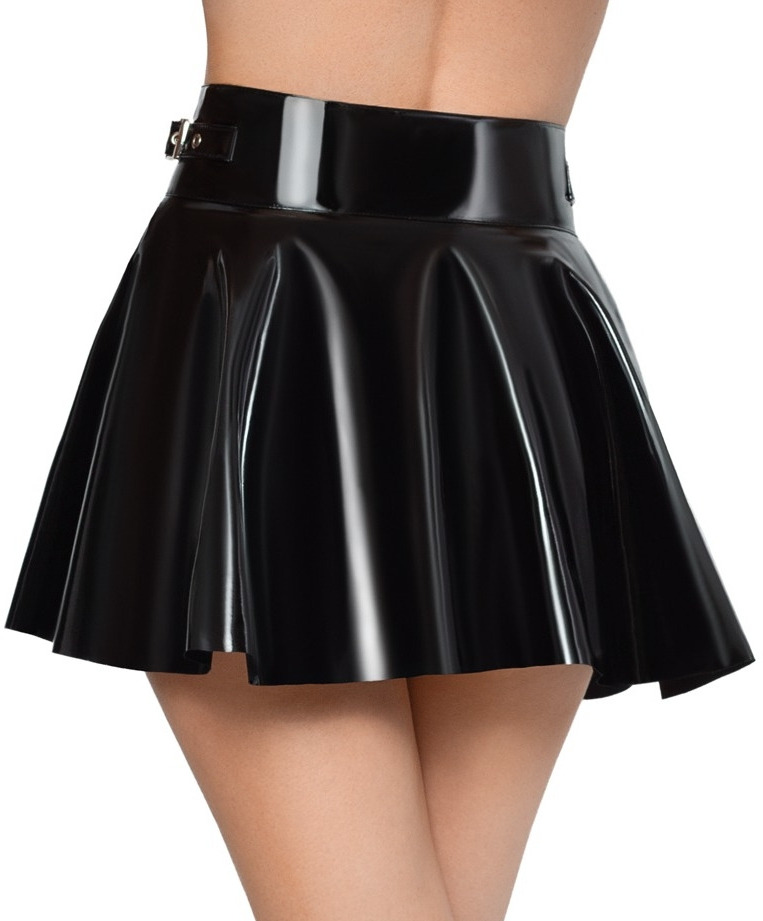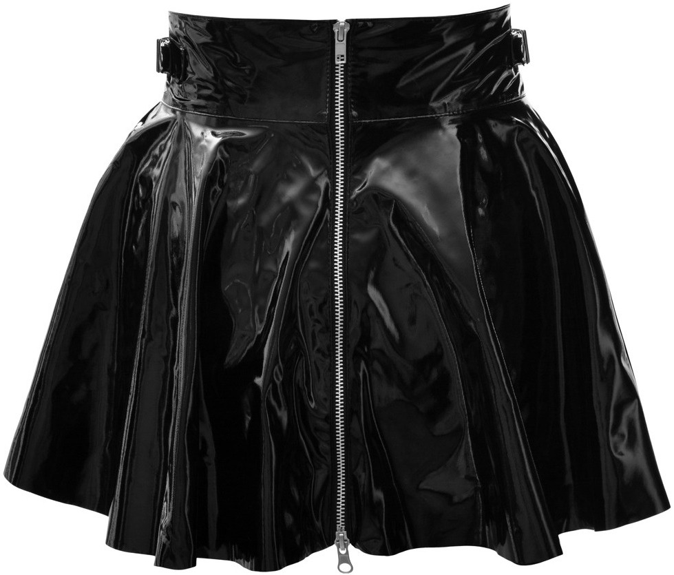 Minisukně je ušitá z lesklého lacku. Na bocích má dvě funkční přezky pro úpravu šířky pasu a na přední straně dlouhý dvoucestný zip – pro snadné oblékání.