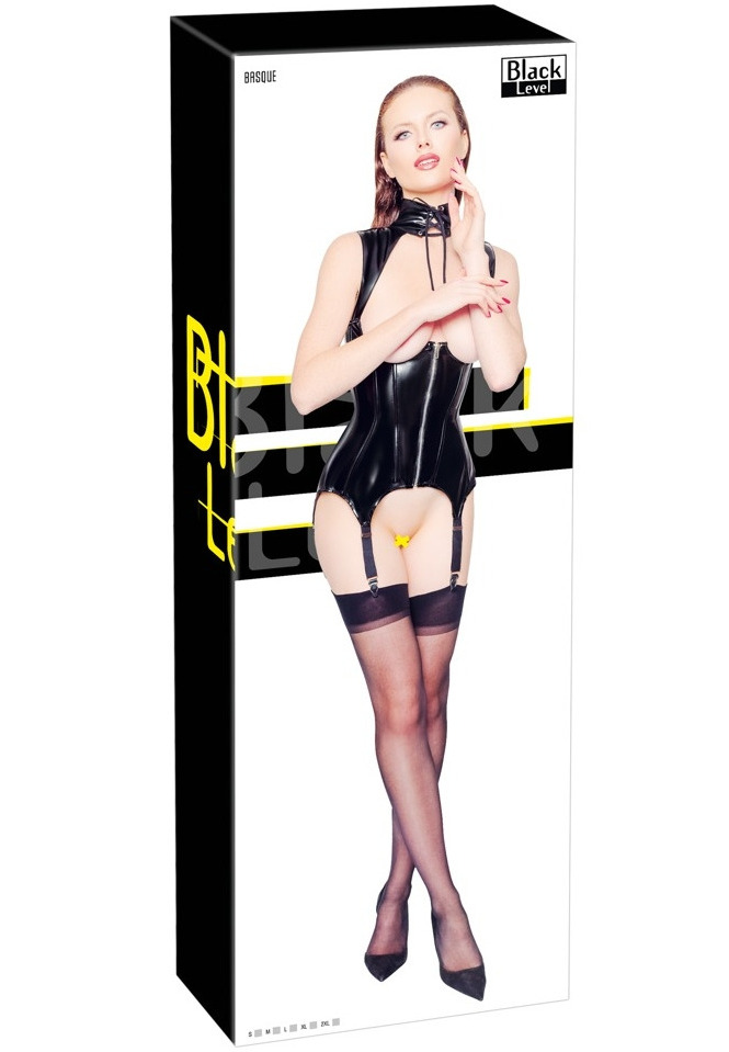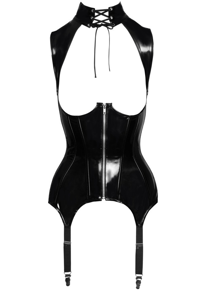 Lakovaný korzet s límečkem, odhalenými ňadry zipem, šněrováním a podvazky Black Level