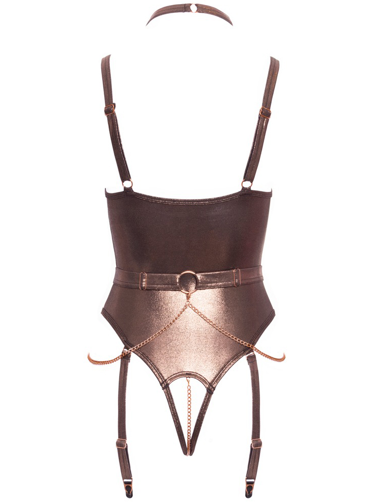 Košíčky mají kostice a jsou měkce vyztužené pro lepší oporu ňader a větší pohodlí. Ramínka jsou délkově nastavitelná a rozkrokem vede odnímatelný řetízek, který při pohybu jemně stimuluje intimní partie.