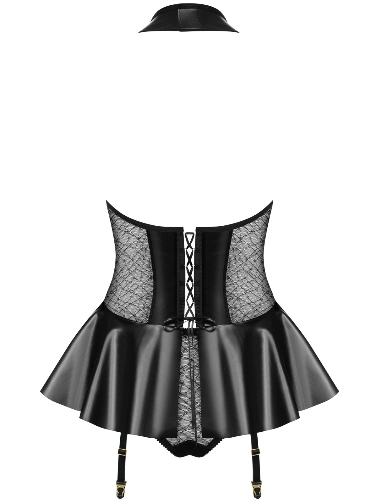 Lesklý korzet se zipem, šněrováním a podvazky + kalhotky Obsessive
