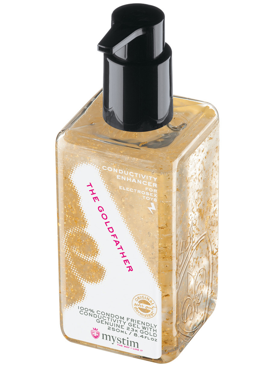 Vodivý lubrikační gel The Goldfather v sobě skrývá spoustu drobných lupínků pravého 23karátového zlata, které zvyšují jeho vodivost během elektrostimulace.
