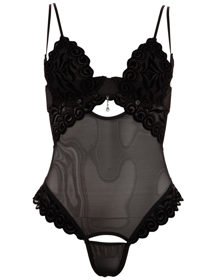 Body je ušito z průsvitné látky. Košíčky a látka v rozkroku jsou zcela odepínatelné – snadno odhalíte ňadra či klín.