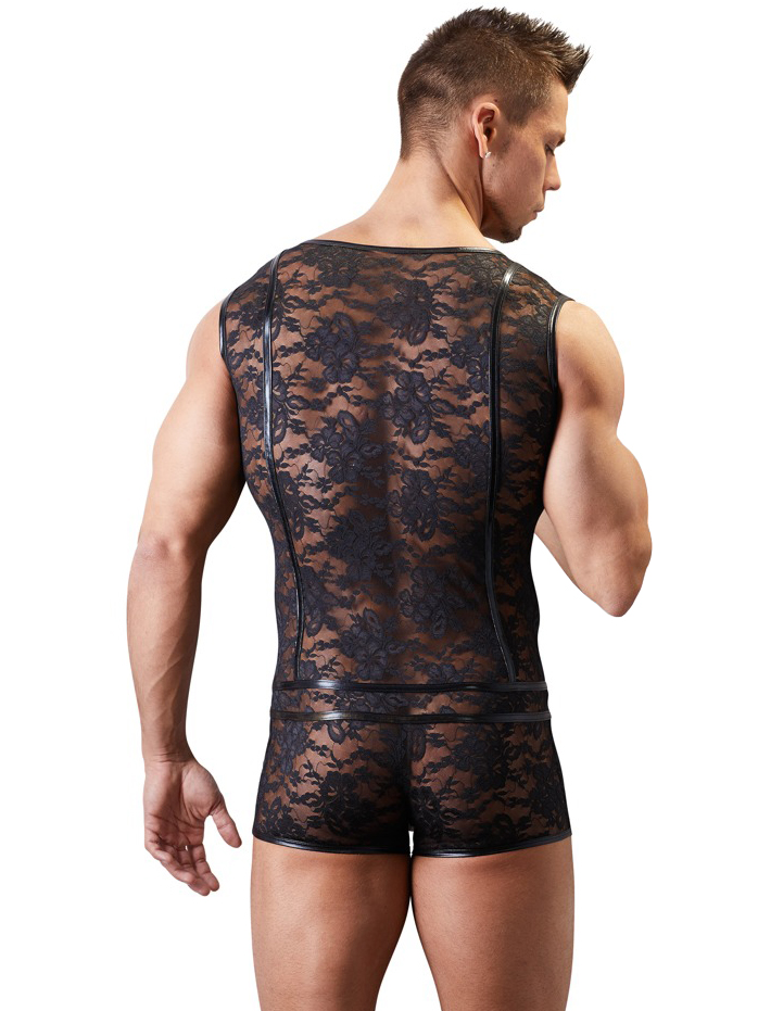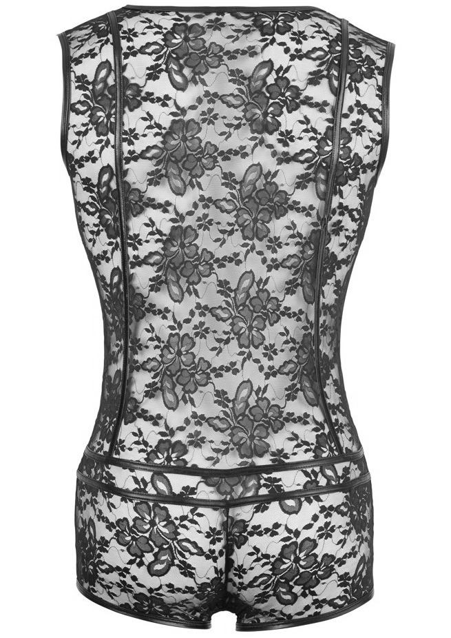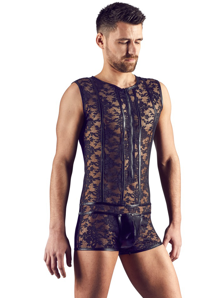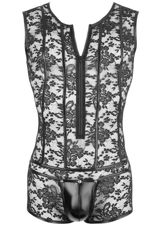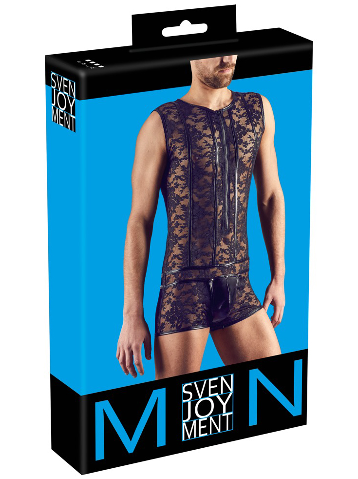 Luxusní krátký pánský overal od Svenjoyment elegantně kombinuje krajku s florálním motivem a lesklé detaily v podobě lemování a poklopce.