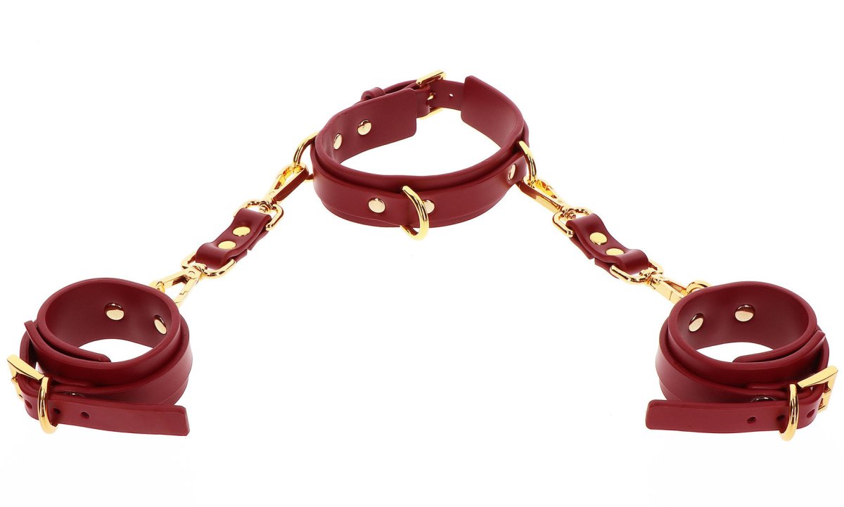 V balení najdete obojek, 2 pouta na ruce a 2 spojovací části s karabinami. Vše je vyrobeno z kvalitní umělé kůže, sada je tak vhodná i pro vegany.