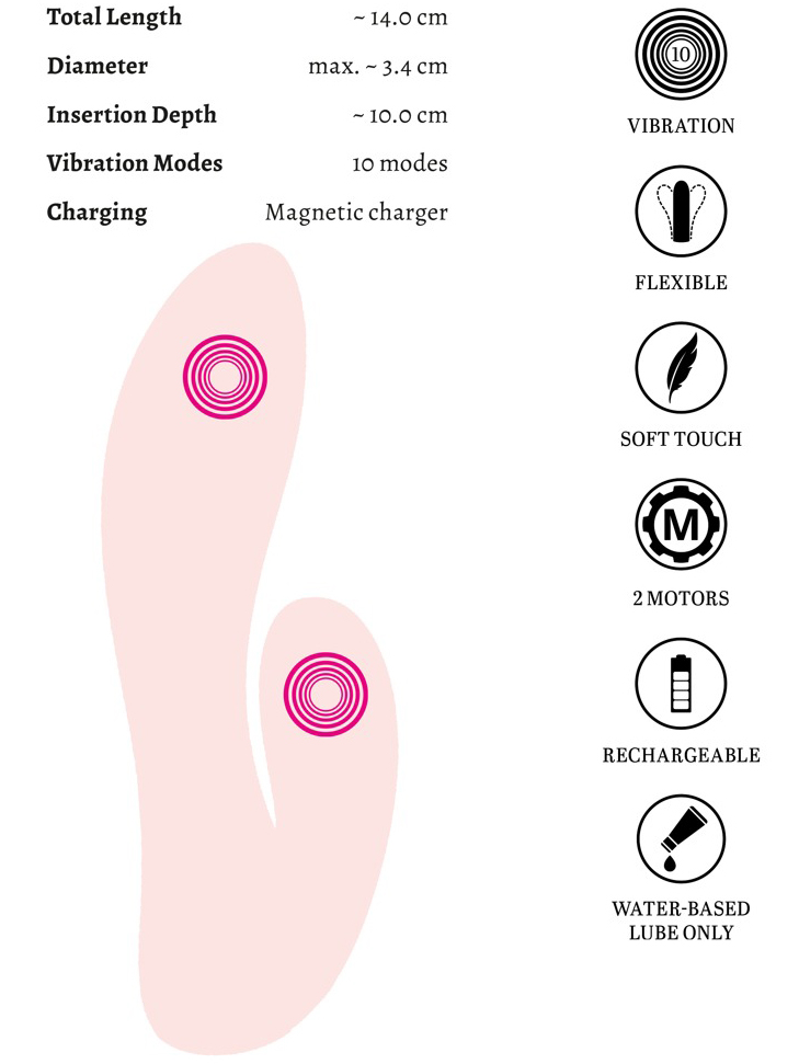 O vibrace se starají 2 motorky (jeden v zasunutelné části, druhý v králíčku) a celkem se můžete těšit na 10 různých vibračních módů. Mezi programy přepínáte jednoduše pomocí jediného tlačítka.