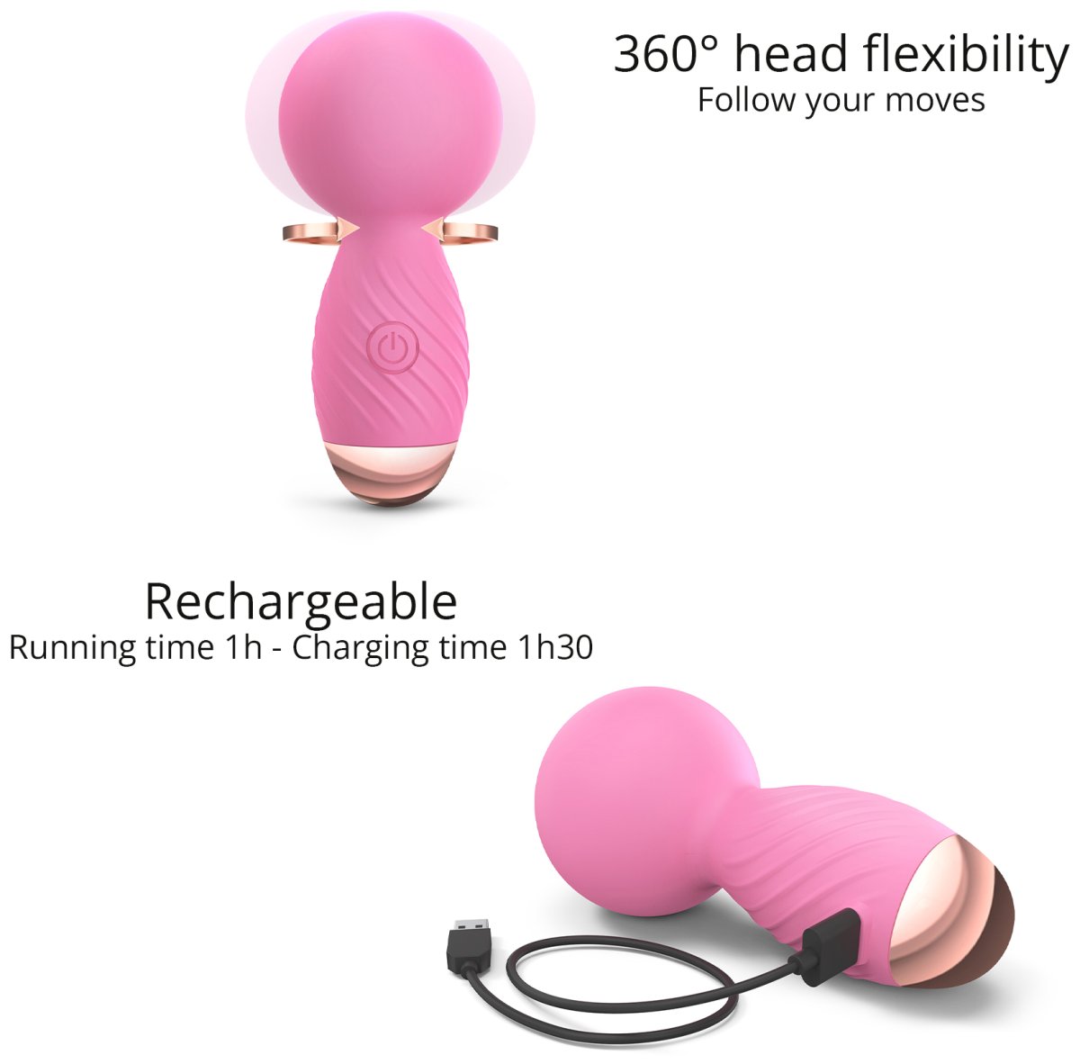 Hlavice je ohebná v rozsahu 360°, takže se jednoduše přizpůsobí křivkám vašeho těla. Extra silné a hluboké vibrace jsou tiché a celkem si vyberete z 9 vibračních programů.