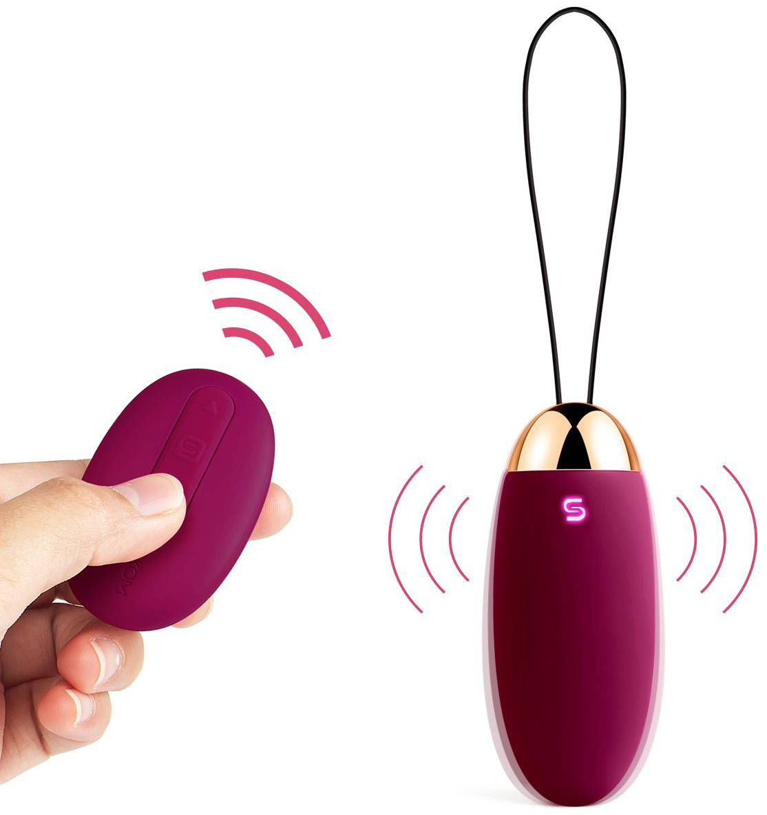 Ovládání dálkovým ovladačem – nejprve aktivujte vajíčko do stand-by módu a poté klikněte na libovolné tlačítko na ovladači. Tím spustíte vibrace. Krátkým stiskem tlačítka S aktivujete inteligentní mód. Krátkými stisky šipek měníte intenzitu vibrací, dvojklikem přepínáte mezi programy. Podržením tlačítka S po dobu 2 sekund vibrace vypnete.