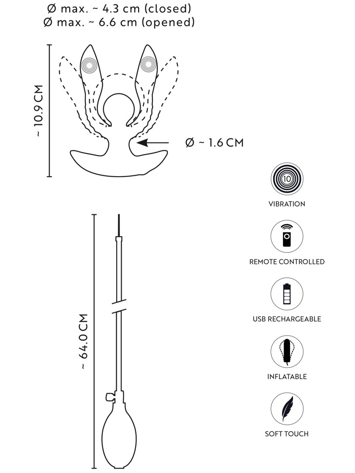 - Rozměry: celková délka 10,9 cm, zasunutelná délka 8,8 cm, max. průměr 4,4 cm (po nafouknutí max. 6,6 cm), tloušťka ramen 1,6 cm, délka hadičky s balonkem 64 cm