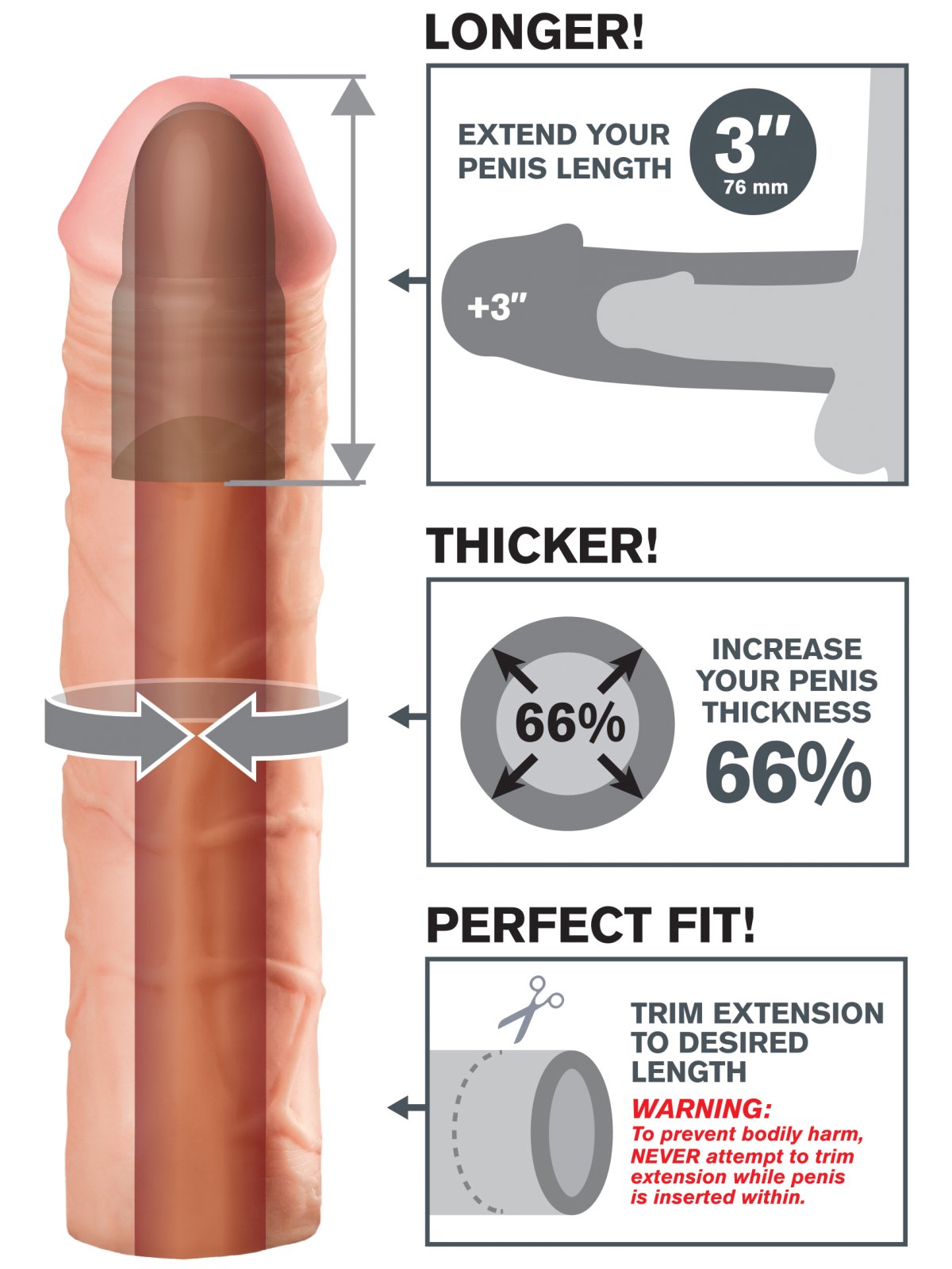 Návlek prodlouží penis o 7,6 cm a zvětší průměr o 66 %. Je vyrobený z realistického materiálu, který je měkký, elastický, sametově hebký a rychle se zahřeje na teplotu těla.