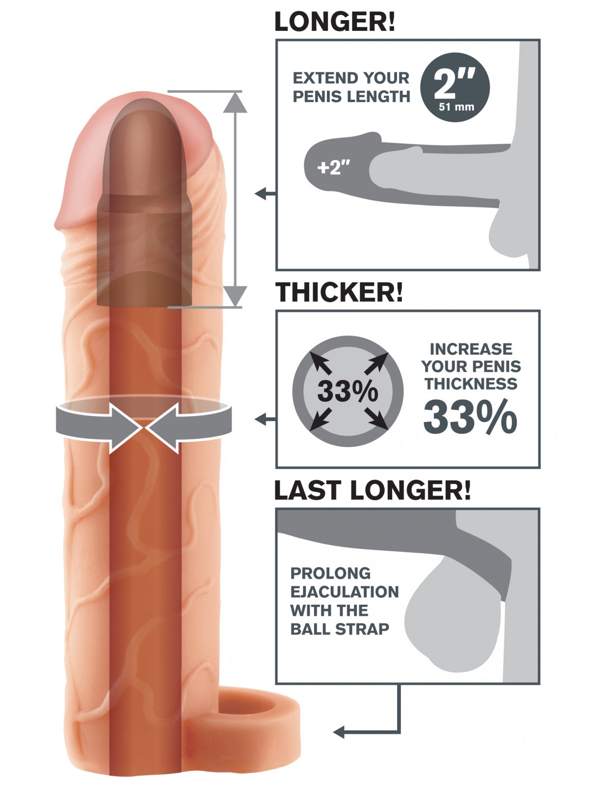 Návlek prodlouží penis o 5,1 cm a zároveň jej zvětší i do šířky. Je vyrobený z realistického materiálu, který je měkký a elastický a na dotek připomíná lidskou pokožku.